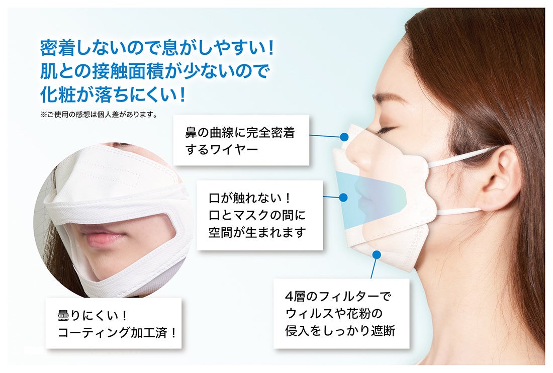 高性能4層構造フィルター使用。立体構造で息がしやすい、対面機会の多い方にピッタリな3Dマスク