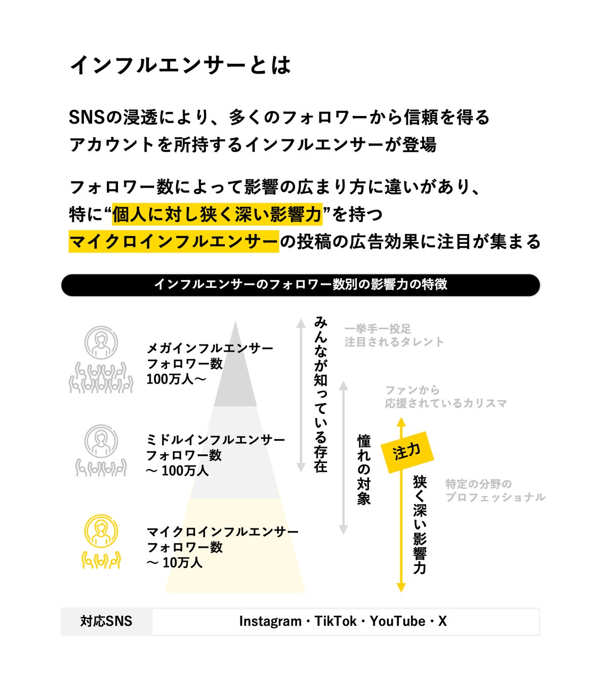 Instagram・TikTok・Xに対応しており、マイクロインフルエンサーの方を中心に約8万人に登録いただいています。