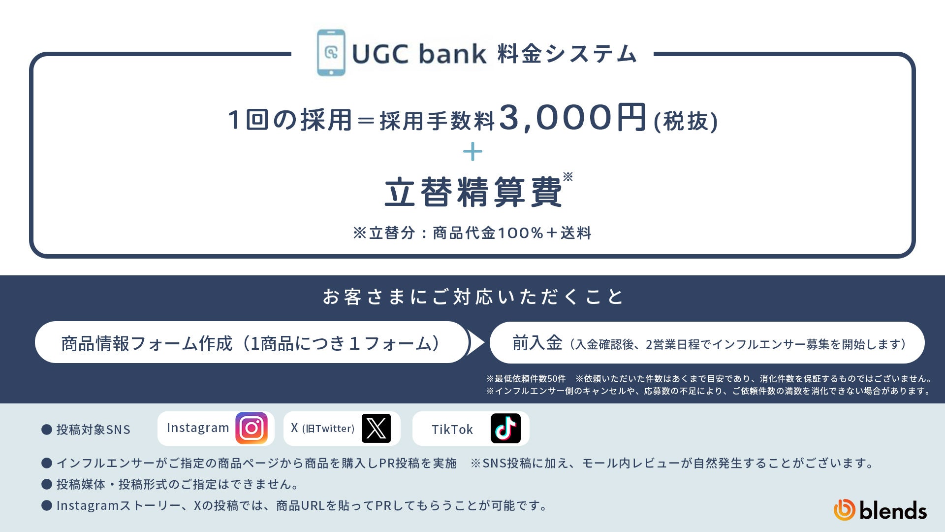 1回の採用あたり手数料(3,000円/税抜)+立替精算費(商品代金と送料)の前入金で『UGC bank』をご利用いただけます。