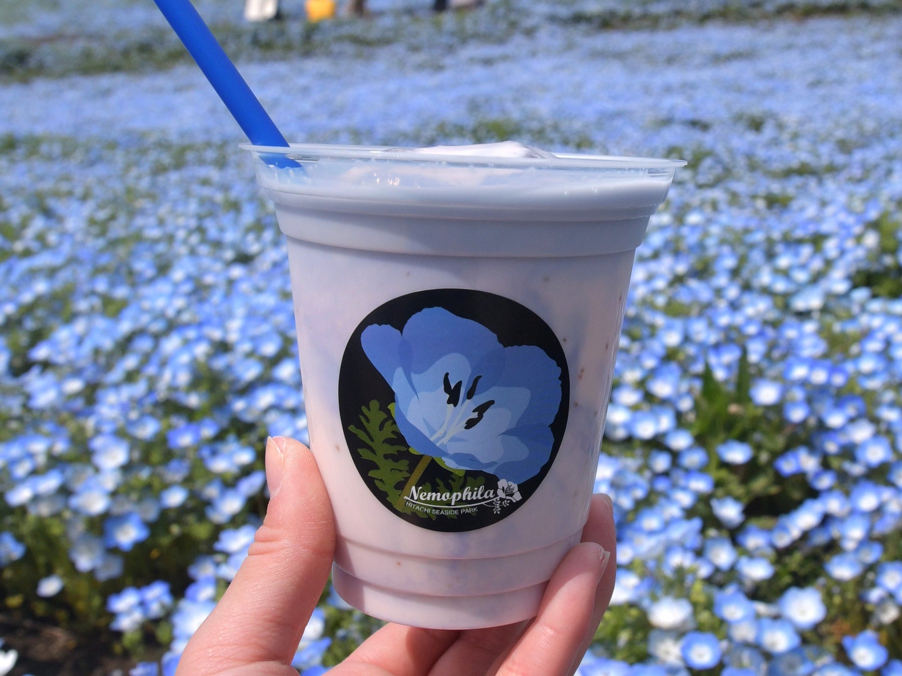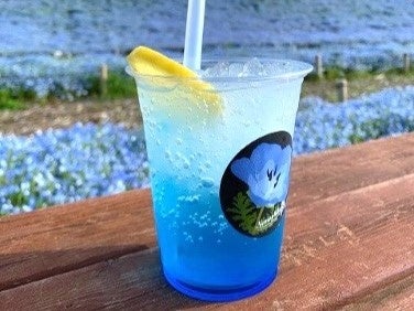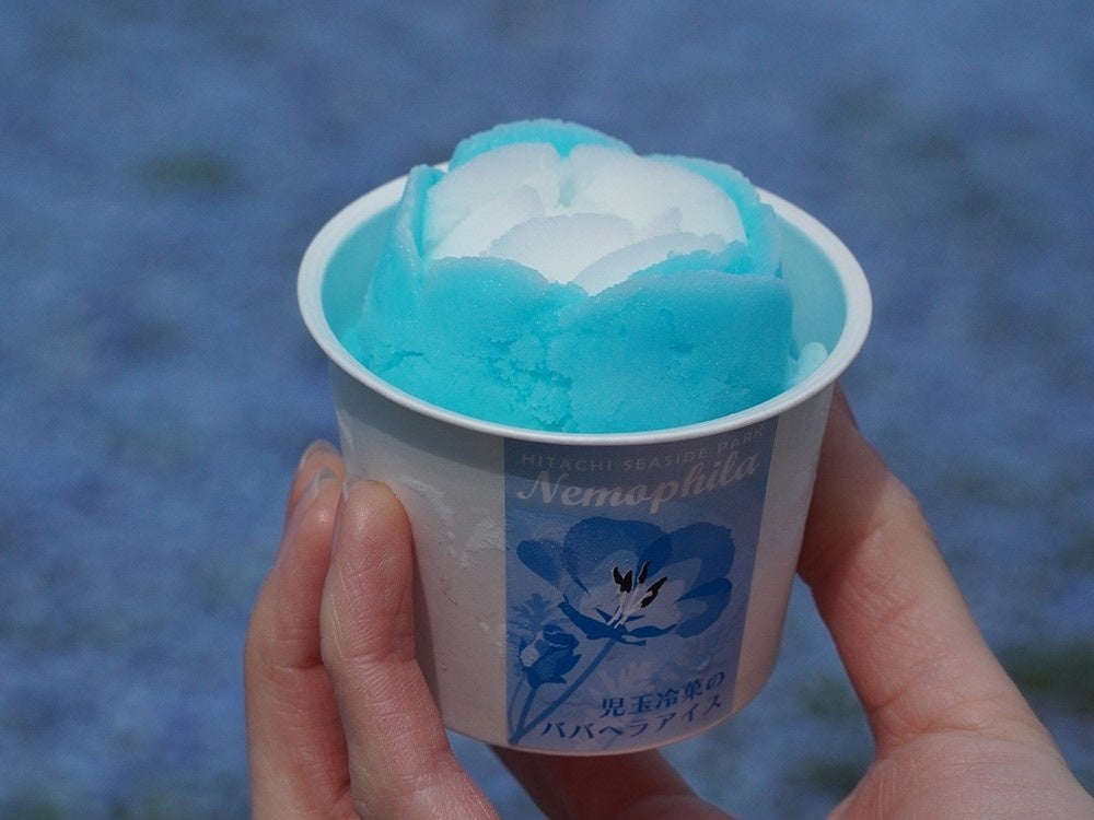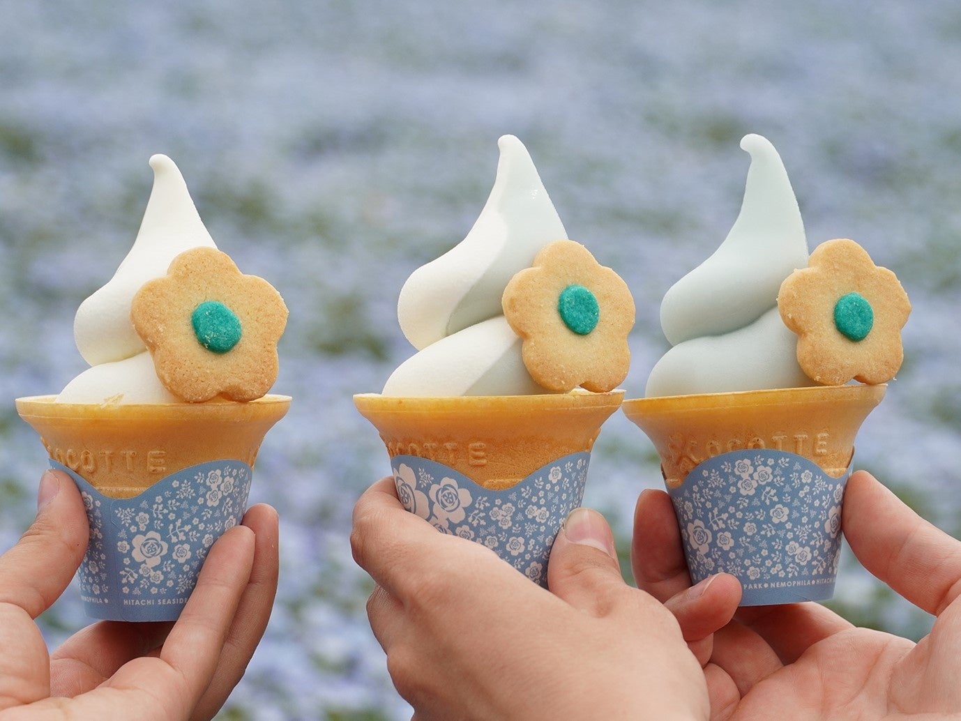 この時期は青の絶景を見るだけでなく味わえるチャンス。ネモフィラにちなんだグルメを花と一緒に楽しめます。手作りネモフィラクッキーが添えられた爽やかなラムネ味の「ネモフィラブルーソフト」は、毎年長蛇の列ができる一番人気のソフトクリームです。秋田直送の名物「ババヘラアイス」は、職人技でネモフィラを表現し爽やかなソーダ味のカップアイスに仕立てました。きれいなグラデーションの「ネモフィラブルーレモネード」など、ネモフィラを背景に写真を撮りたくなる逸品ぞろいです。ほかにもネモフィラブルーを楽しめるグルメも充実、公園内の売店やお土産コーナーに青のグルメが彩りを添えます。
