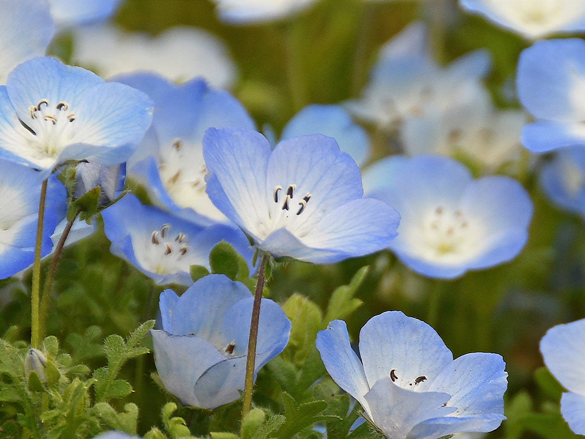 ネモフィラはムラサキ科(旧ハゼリソウ科)ネモフィラ属で、北アメリカ原産の一年草。高さ10~20cmほどの株に、直径2~3cmの小さな青い花を咲かせます。属名の「ネモフィラ」は、ギリシャ語の「ネモス(小森)」と「フィレオ(愛する)」を合わせた言葉で、森林の周辺に自生することに由来しています。花言葉は、その花姿から「可憐」、アメリカからヨーロッパに渡ってからも現地に根付いたことから「どこでも成功」などが広く知られています。