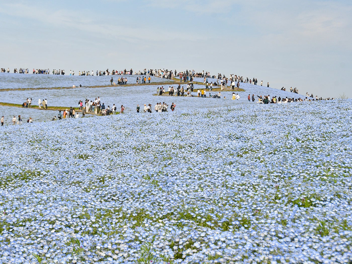 国営ひたち海浜公園の「みはらしの丘」では、約530万本のネモフィラが見頃(満開)となり、連日多くの来園者でにぎわっております。見頃のピークは27日頃まで続き、5月4日まで花数が比較的多い状態でお楽しみいただける見込みです。丘を覆いつくす青のネモフィラと、どこまでも続く青空が溶け合う青の絶景をご覧ください。