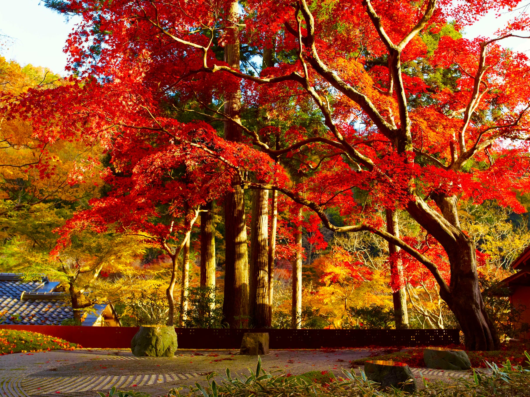 嵐山は古くから紅葉の名所として知られ、白河上皇の和歌に「大井川 ふるき流れを たづねきて 嵐の山の もみぢをぞ見る*2」とあるように、歌枕として数多くの和歌に詠まれている場所です。白砂と燻し瓦で模した枯山水が広がる奥の庭では、樹齢400年のオオモミジが深紅に色づく様子が楽しめます。光源氏が雅な舞を披露した場面と奥の庭で眺める景色が重なり、源氏物語に描かれる風流な一幕へと誘われます。