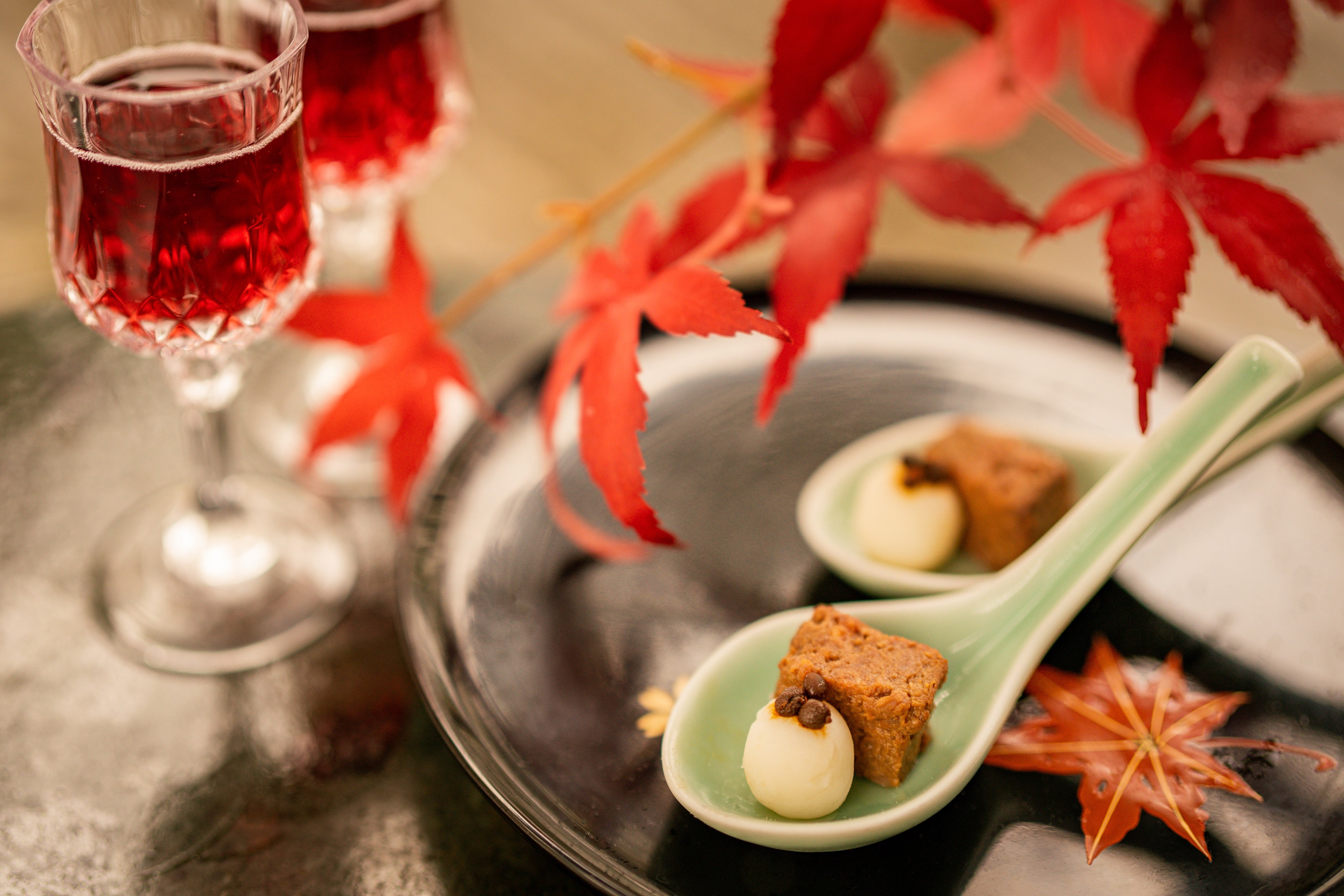 源氏物語に紅葉の下で青海波を舞った一節や、紅葉の情景を詠んだ和歌があるように、平安貴族は秋になると紅葉を眺めながら過ごしていました。また、現在では別名「もみじ」と呼ばれる鹿肉を味わっていたとされています。青海波の舞を鑑賞した後は、深紅に染まるオオモミジの下で、鹿肉のテリーヌと特製のカクテルを味わいます。テリーヌはしっかりと旨味のある鹿肉に、百合根のマッシュと山椒の醤油漬けを合わせバランスよく仕立てました。特製カクテルは赤ワインに柚子のスパークリングを合わせ、鹿肉との相性も抜群です。平安貴族が紅葉を眺め過ごした情景さながらに、優雅な時間が過ごせます。
