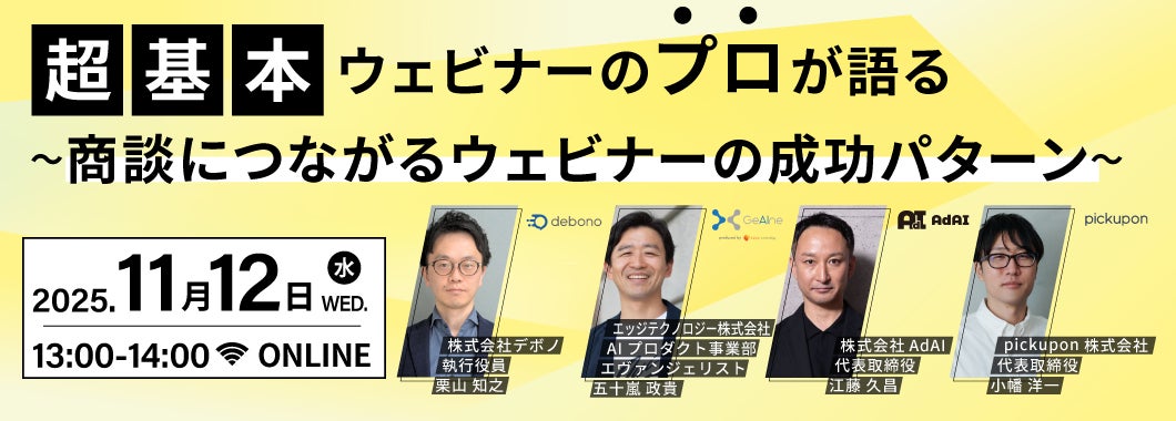 pickupon株式会社(千葉県市川市、代表:小幡洋一、以下pickupon)の代表・小幡は、11月12日(水)開催の4社によるウェビナー「【超基本】ウェビナーのプロが語る ~商談につながるウェビナーの成功パターン~」に登壇いたします。オンラインでの営業活動が主流となる中で、ウェビナーを開催しても見込み客の獲得につながりにくいという、多くの企業が抱える課題に対する必要な視点や具体的な成功事例をお話しします。