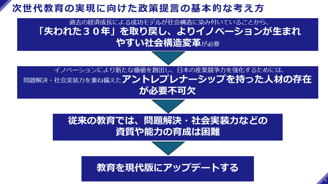 本提言は昨年6月に発足した次世代教育ワーキンググループ(https://jane.or.jp/proposal/theme/20365.html)等で約1年間かけて議論してきた内容を基に、政策提言としてとりまとめたものです。