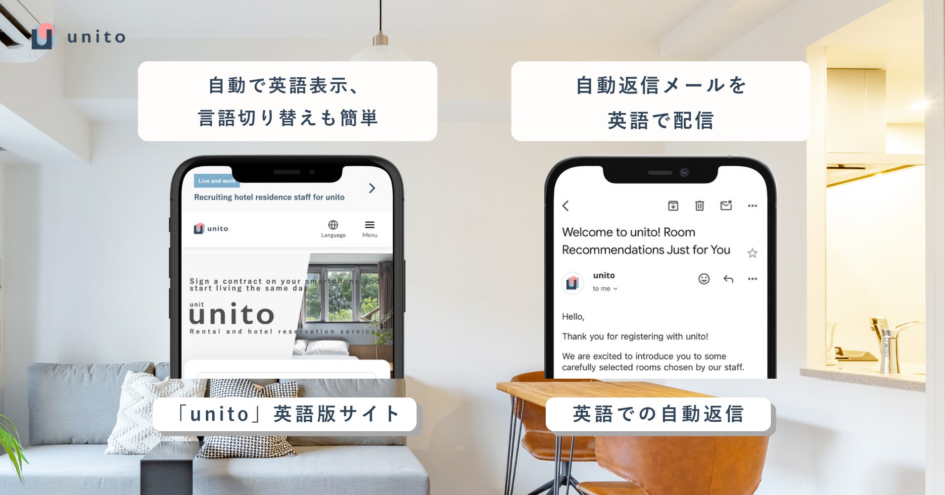 「unito」英語版サイトから物件に関する問い合わせをすると、日英併記の返信メールが送信されるようになりました。海外の利用者が物件の詳細を理解しやすくなり、安心して問い合わせや、やり取りができる環境を整えています。