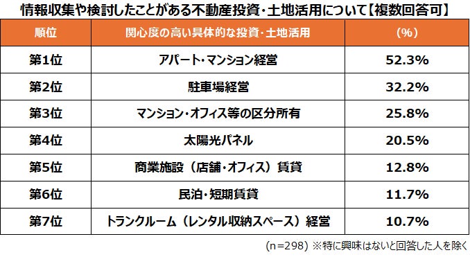 次いで、「駐車場経営」(32.2%)や「マンション・オフィス等の区分所有」(25.8%)といった、比較的初期投資を抑えながらも運用がしやすいタイプの投資が続きました。特に都心部や駅近エリアでは、駐車場経営への注目が高まっている点も示唆されます。