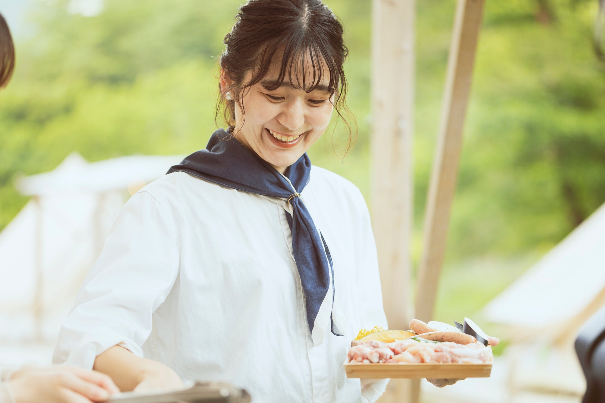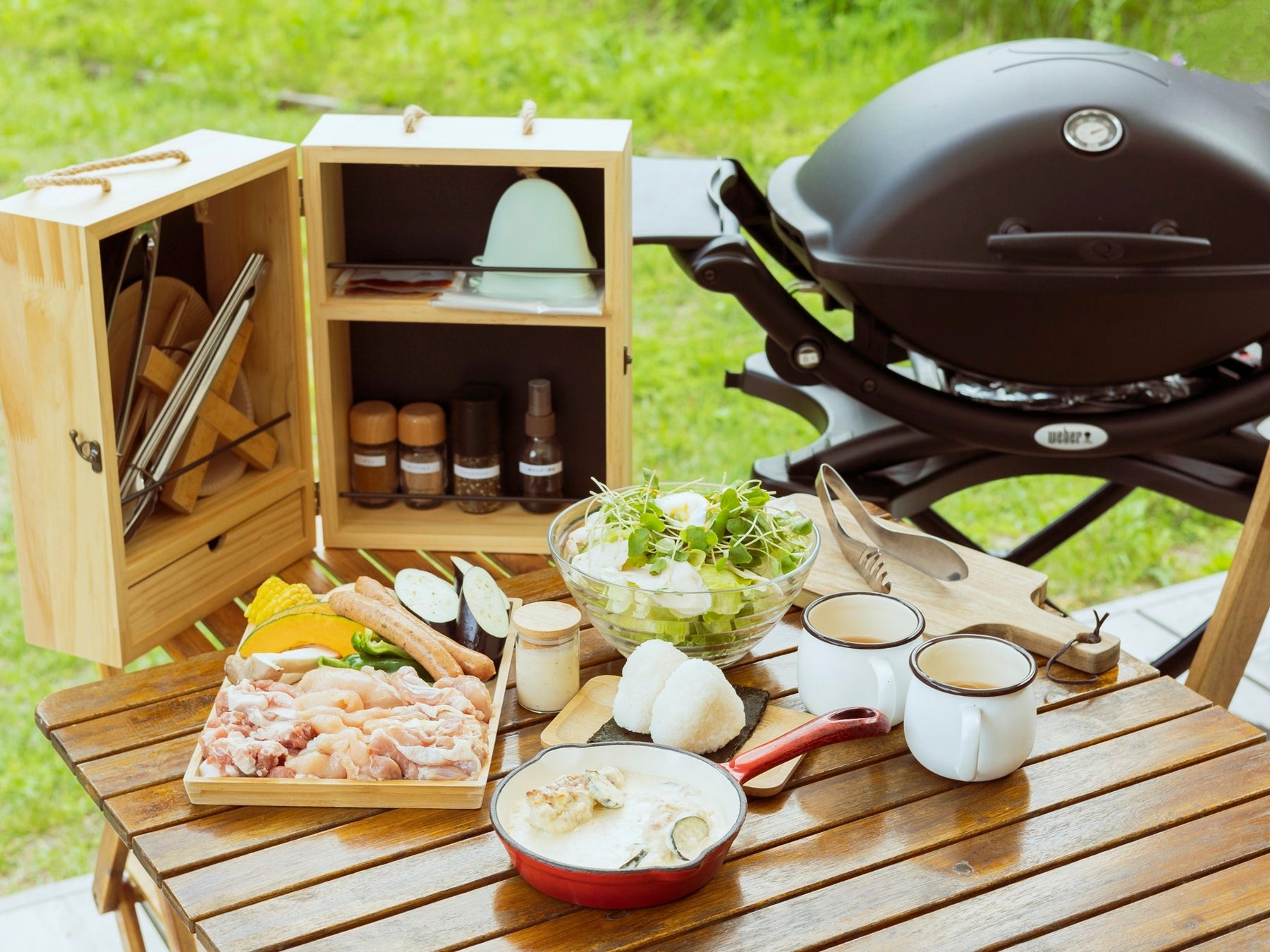 BBQはテント前の屋根のついたウッドデッキにて、本場アメリカweber社のガスグリルでお楽しみいただけます。着火や準備、片付けなどは全てスタッフで行いますので、はじめての方でも心配不要。調味料・お皿もすべて用意しているため、事前に食材や食器を持ってくる必要がないのもうれしいポイントです。