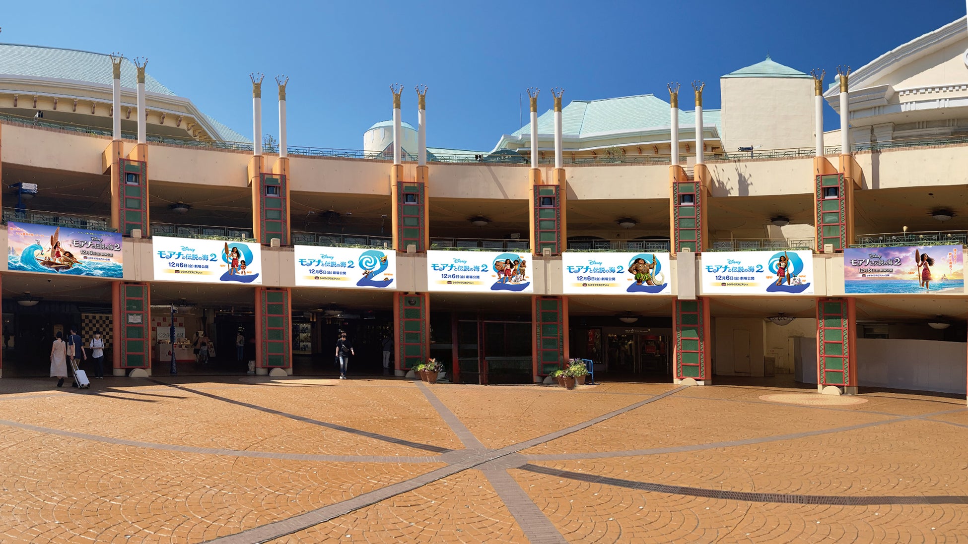 さらに、この期間だけの特別仕様の装飾として、JR舞浜駅南口改札から続く、2F エントリー・プラザ入口のゲートでは、美しいビジュアルがデザインされた大きなバナーが皆さまをお迎えし、ゲートをくぐり抜けた先の館内へ続くアーチや壁面には、主人公モアナが描かれたオリジナルのフラッグバナーなどが登場。