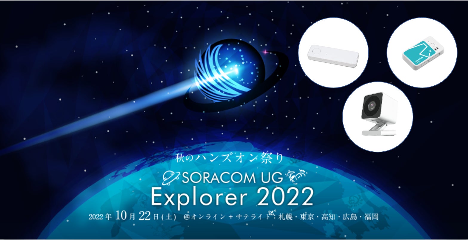 株式会社ソラコムは、IoTプラットフォームSORACOMのユーザーが集うSORACOMユーザーグループが2022年10月22日(土)に開催する「SORACOM UG Explorer 2022 秋のハンズオン祭り!」を後援します。本イベントは、札幌・東京・広島・高知・福島、全国5カ所とオンラインでご参加いただけます。