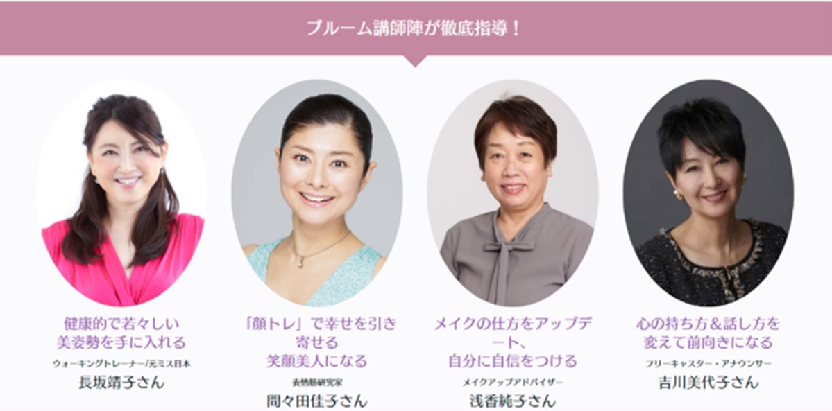 参加者3人には、ハルメクの一流講師陣による4回の集中レッスンを受講してもらいました。変身をサポートするブルーム講師陣は、「ハルメク」の講座・イベントで人気の4人です。