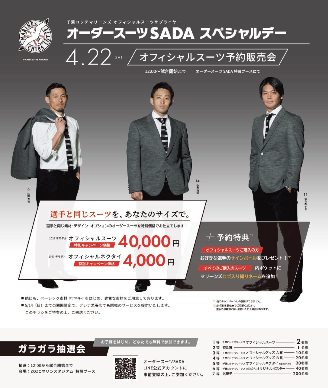 「千葉ロッテマリーンズ」 オフィシャルスーツサプライヤーオーダースーツ SADA スペシャルデーオフィシャルスーツ予約販売会 4 月 22 日(土)開催