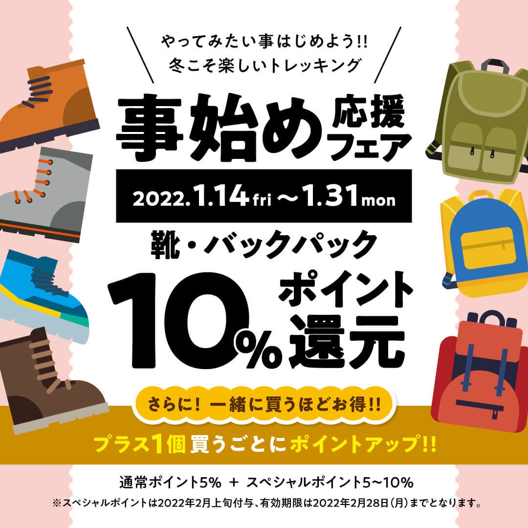 さまざまな希望や期待を胸に、気持ちが弾む新しい年の始まり。好日山荘は今年も登山・アウトドアを愛する皆さまを全力で応援します。登山靴・バックパックがメンバーズポイント10%還元、さらに、登山靴もしくはバックパックの他にジャケットや小物などプラス1点商品をご購入いただくごとに、最大15%ポイントアップとなる大変お得な「事始め応援フェア」を開催します。これから新しい道具と共に登山を始めたいという方にぴったりの機会となります。