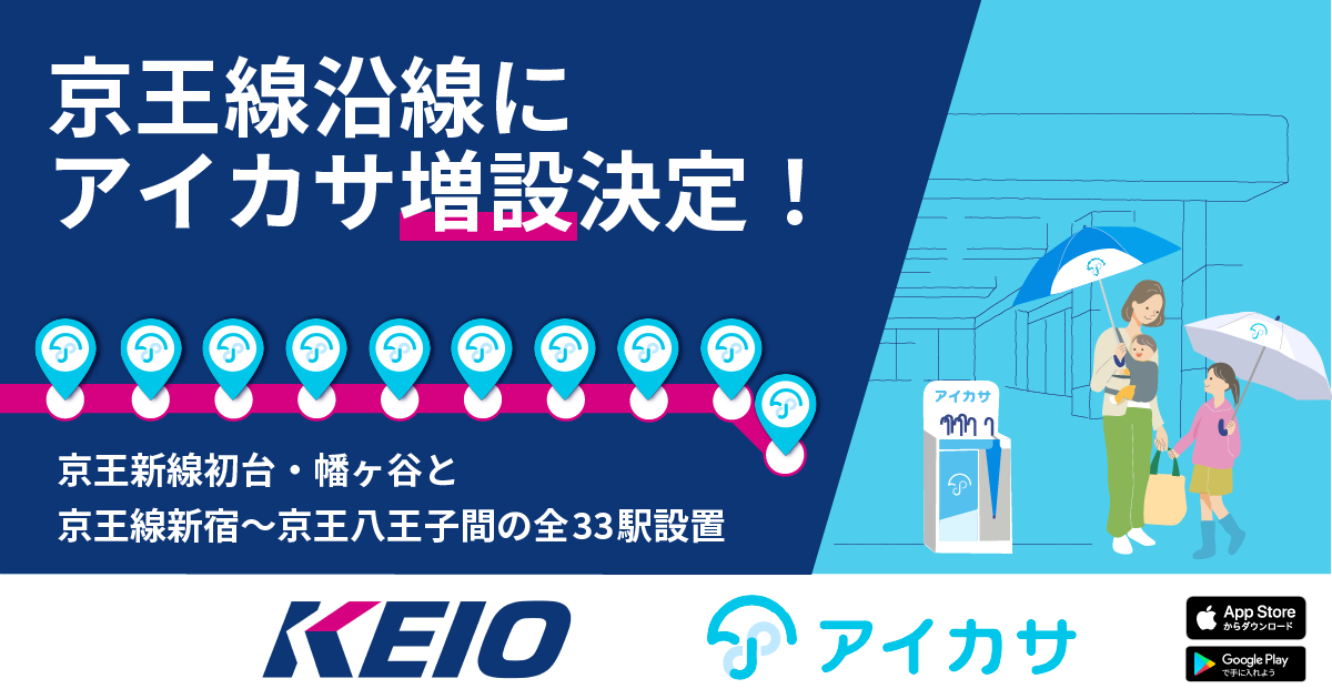 アイカサ、京王新線初台・幡ヶ谷と京王線新宿~京王八王子間の全33駅にも追加設置!多くのお客様からの希望により実現。梅雨の移動を快適に!