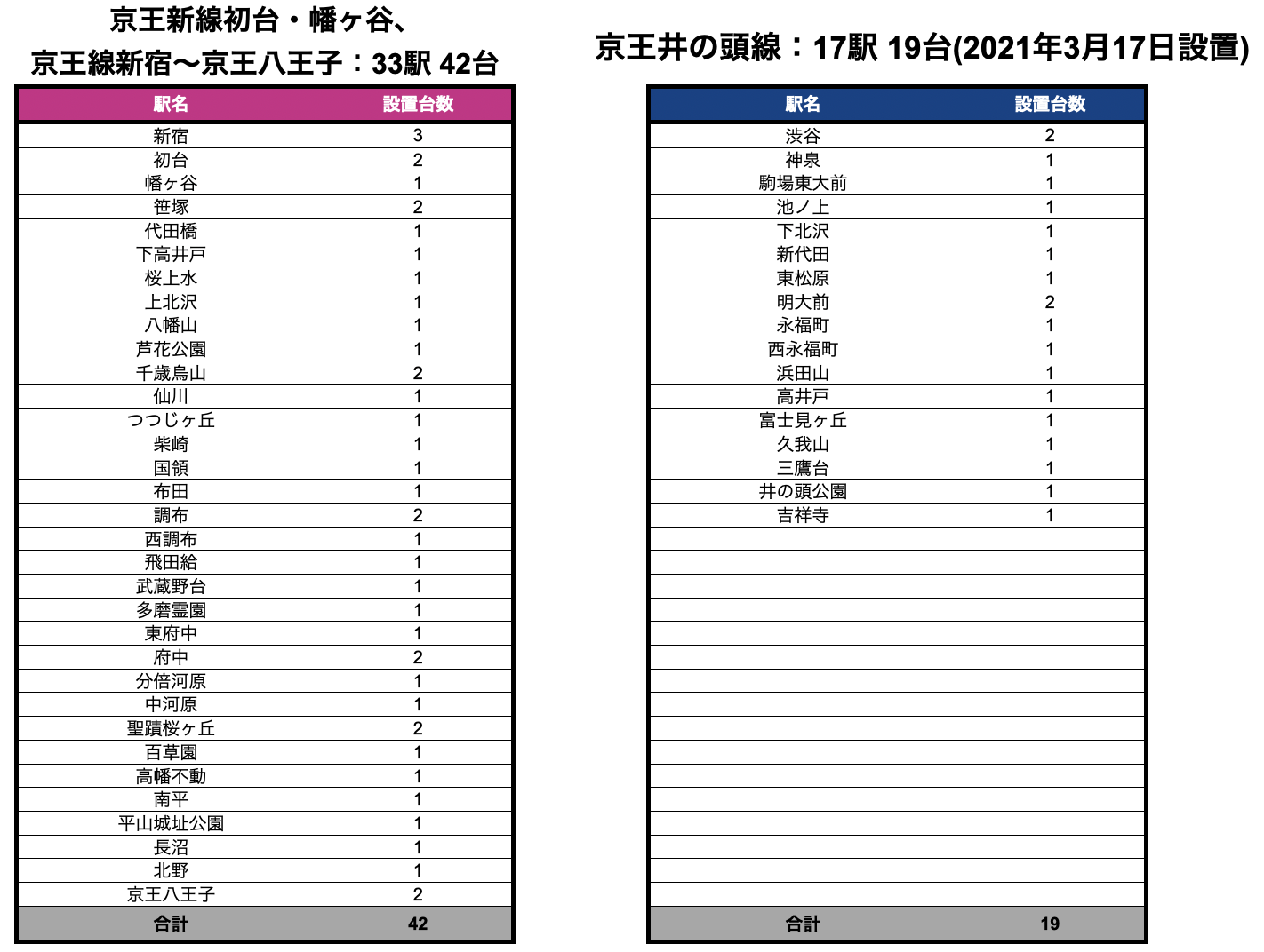 今回の増設により京王井の頭線と合わせて京王沿線では計50駅が設置完了