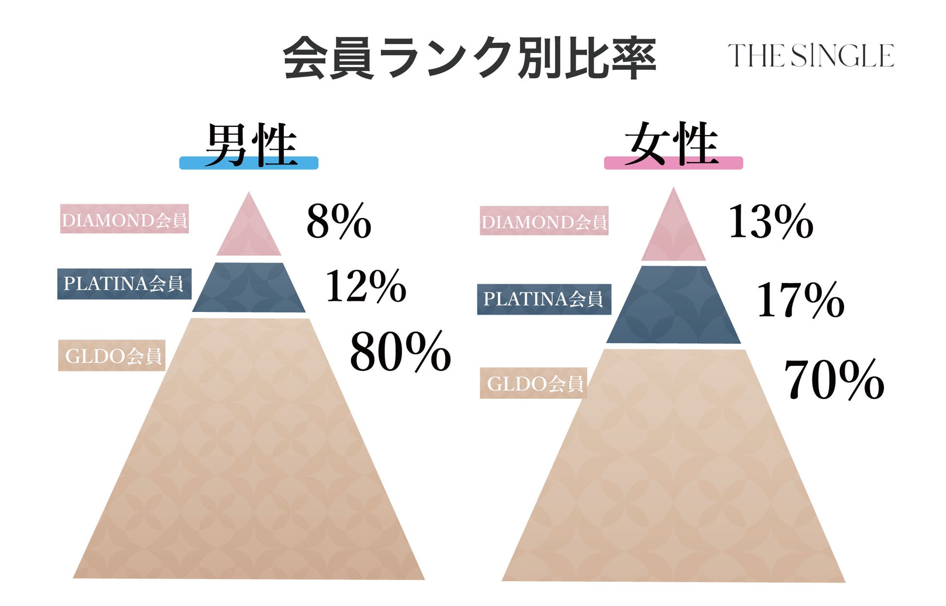 PLATINA会員は「相席回数20回以上かつ個人評価3.5以上」、DIAMOND会員は「相席回数50回以上かつ個人評価4.0以上」が条件となっている中で、会員ランク制度を導入してから3ヶ月ほどでたくさんの方がランクアップして、THE SINGLEでの相席を楽しんでいただいています。質の高いランク別イベントのご招待や、優先入場、入店前に店舗入口にて店内の「年齢/男女比率」がご確認いただける店内状況の事前確認(女性のみ)などさまざまな特典があり、今後もさらにお客様に喜んでもらえるような特典や企画を実施予定ですので、ぜひTHE SINGLEへ来店してランクアップをしてみてはいかがでしょうか?