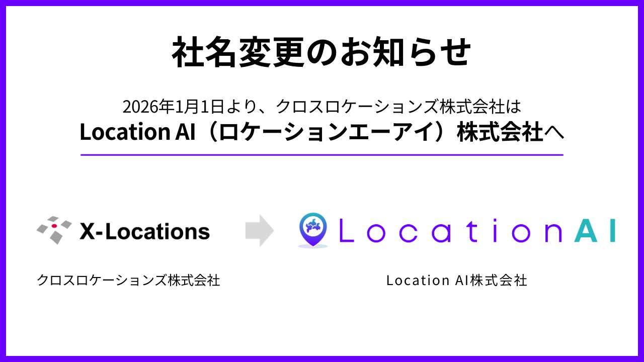 クロスロケーションズ株式会社(東京都渋谷区、代表取締役:小尾 一介、以下「クロスロケーションズ」)は、昨日11月27日の臨時株主総会の決議を経て、2026年1月1日付で社名を「Location AI株式会社(ロケーションエーアイ株式会社)」へ変更し、コーポレートアイデンティティ(CI)を刷新することをお知らせいたします。当社は2018年の創業以来、位置情報ビッグデータをAI技術のマシンラーニングにより処理する「Location Engine™」および、そのデータを分析・可視化するクラウドプラットフォーム「Location AI Platform®(以下、LAP)」を開発・提供してきました。
