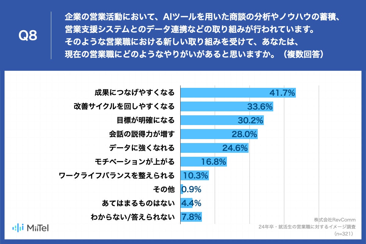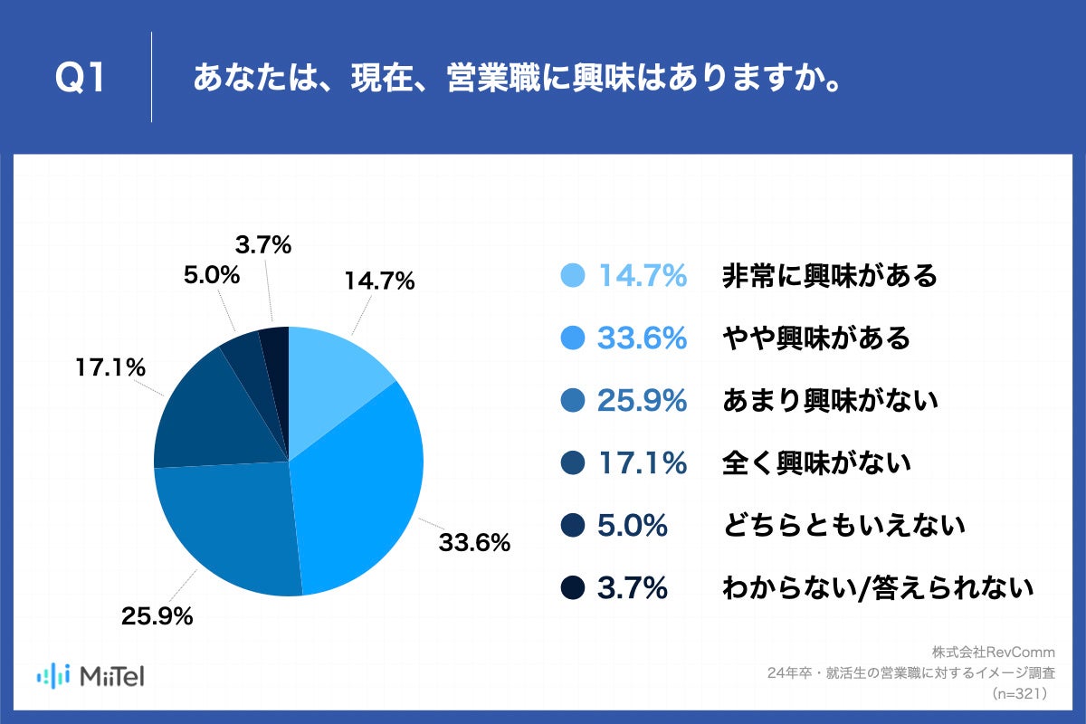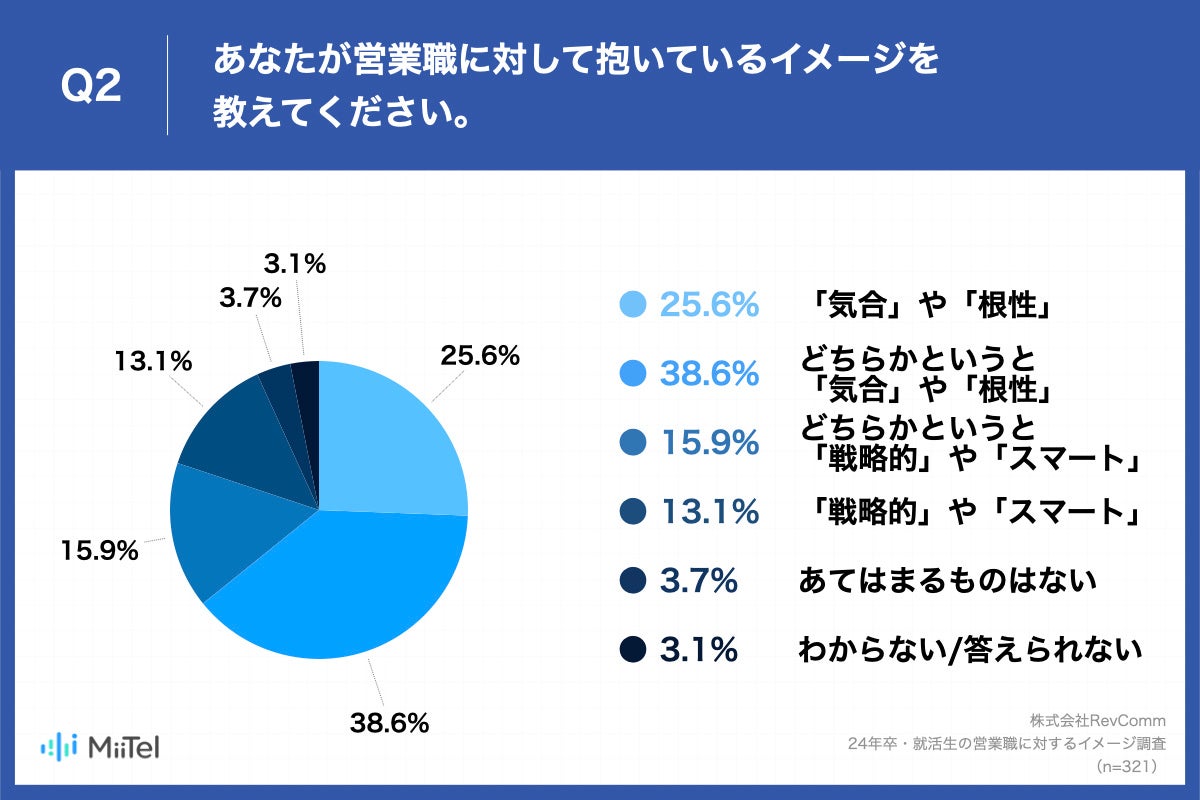 株式会社RevComm(レブコム、本社:東京都渋谷区、代表取締役:會田武史)が提供する音声解析AI電話「MiiTel(ミーテル)」(https://miitel.com/jp/)は、2024年卒業予定で就職活動中の大学生321名を対象に、24年卒・就活生の営業職に対するイメージ調査を実施いたしましたので、お知らせいたします。