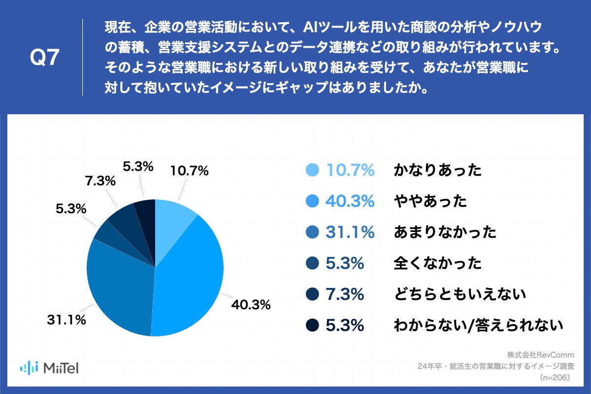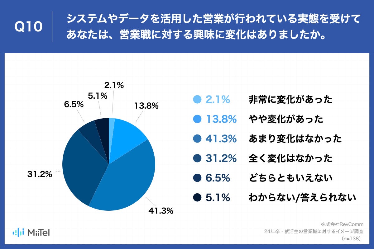 また、システムやデータを活用した営業が行われているという実態に対し、「気合」や「根性」というイメージを抱いていた就活生の半数以上がギャップを感じたということがわかりました。同時に、システムやデータを活用した営業手法には、「成果につなげやすくなる」や「改善サイクルを回しやすくなる」など、ポジティブな声も挙がりました。