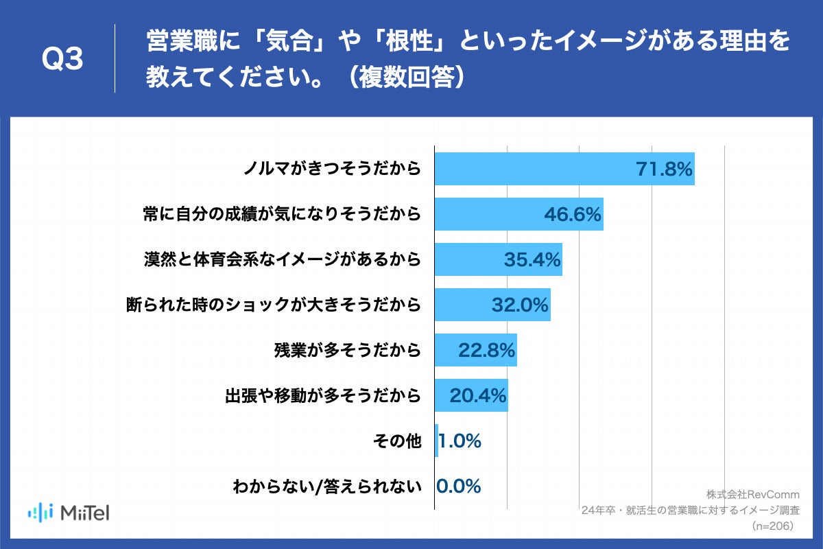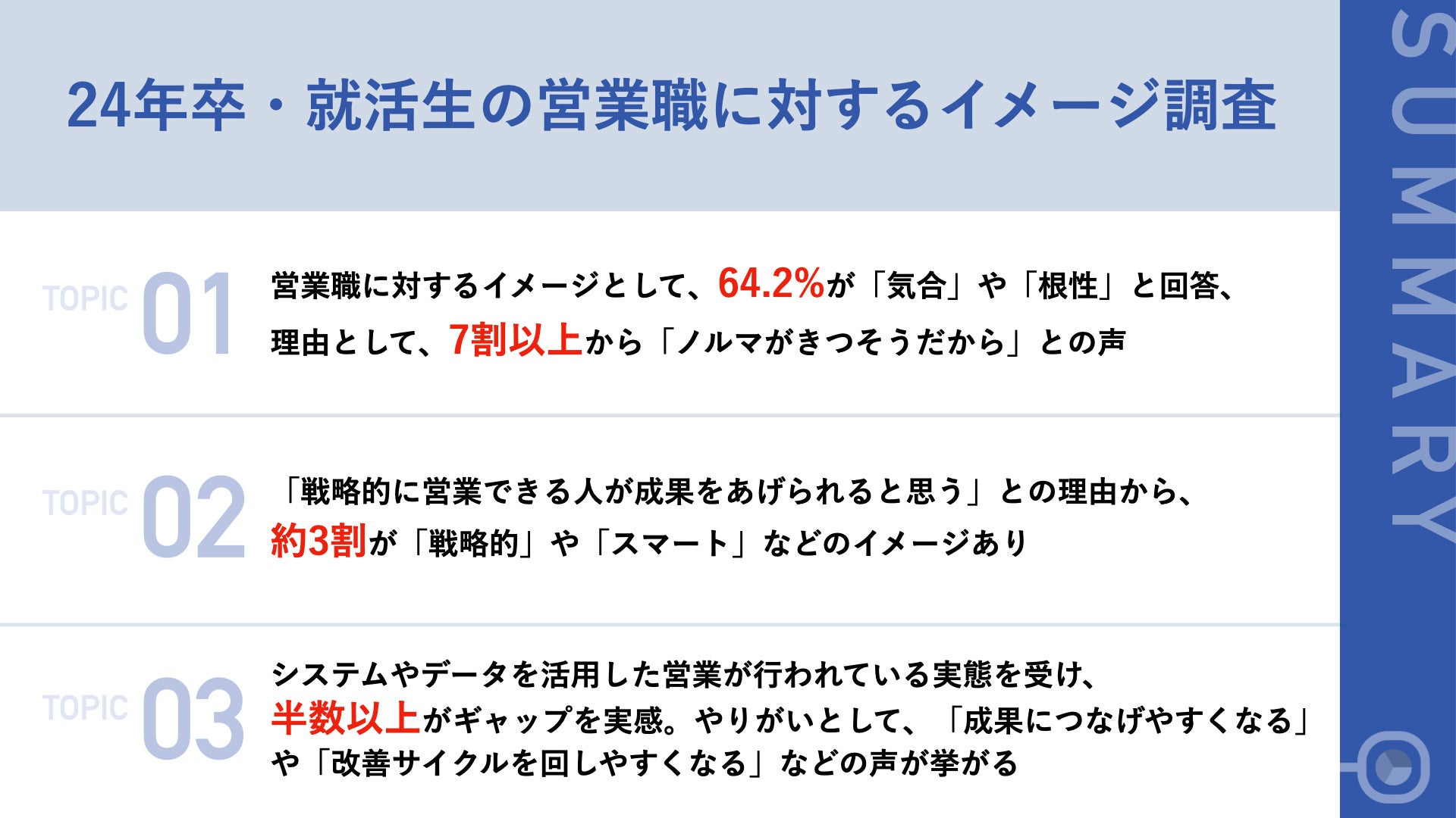 就活生の抱く営業職に対するイメージとして、64.2%が「気合」や「根性」と回答しており、理由として「ノルマがきつそうだから」が最多の意見となりました。一方で、「戦略的に営業できる人が成果をあげられると思う」との理由から、「戦略的」や「スマート」などのイメージを持つ人も一定数いることが明らかになりました。