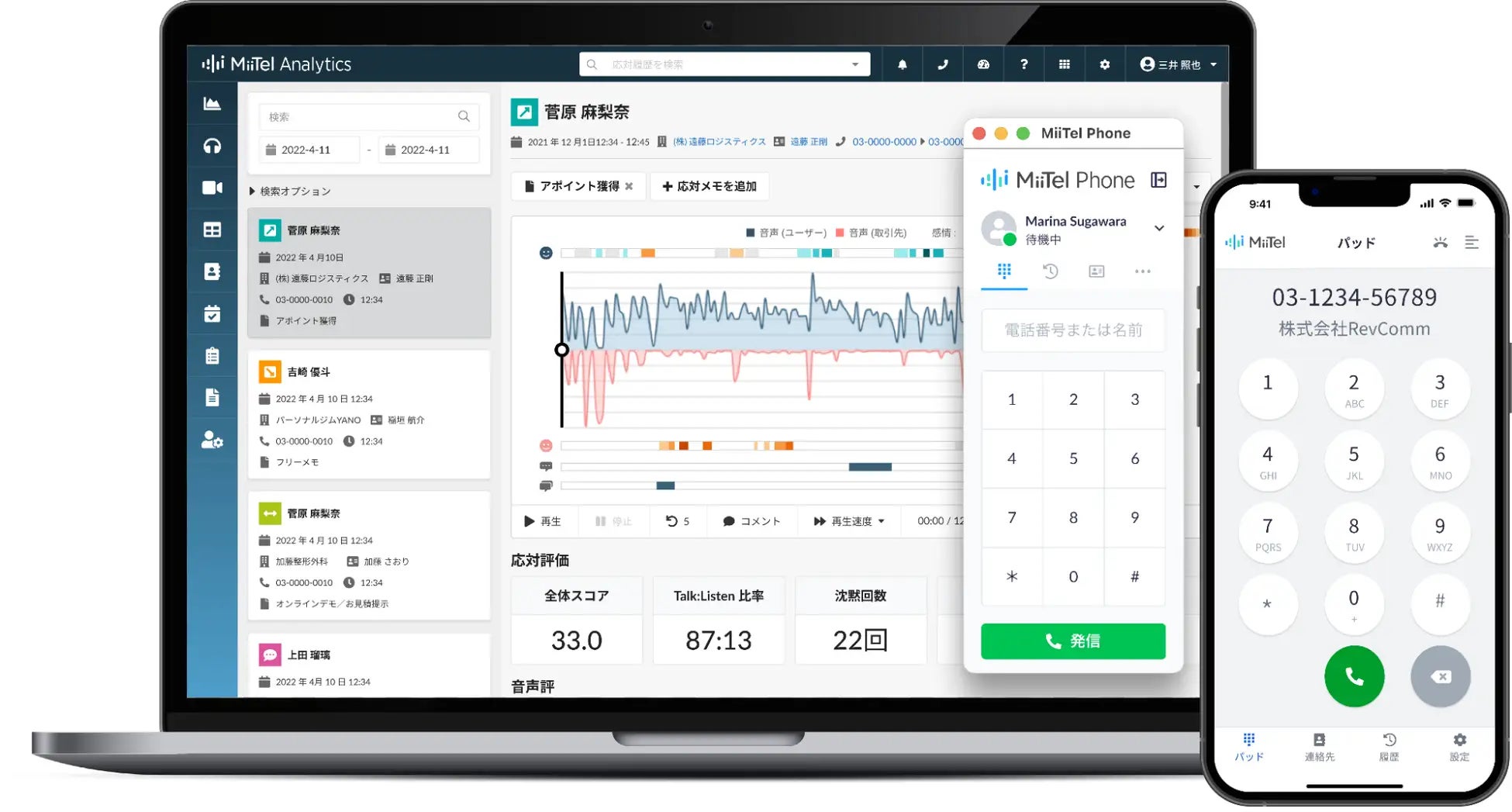 音声解析AI電話「MiiTel」は、インサイドセールス市場を中心に、営業やコールセンター業務におけるトークの可視化とセルフコーチング、テレワーク体制構築にご活用いただいています。また、オンライン商談ツール「MiiTel for Zoom」は、複数人でのオンライン商談の解析や振り返りが可能となり、営業の成約率を飛躍させます。