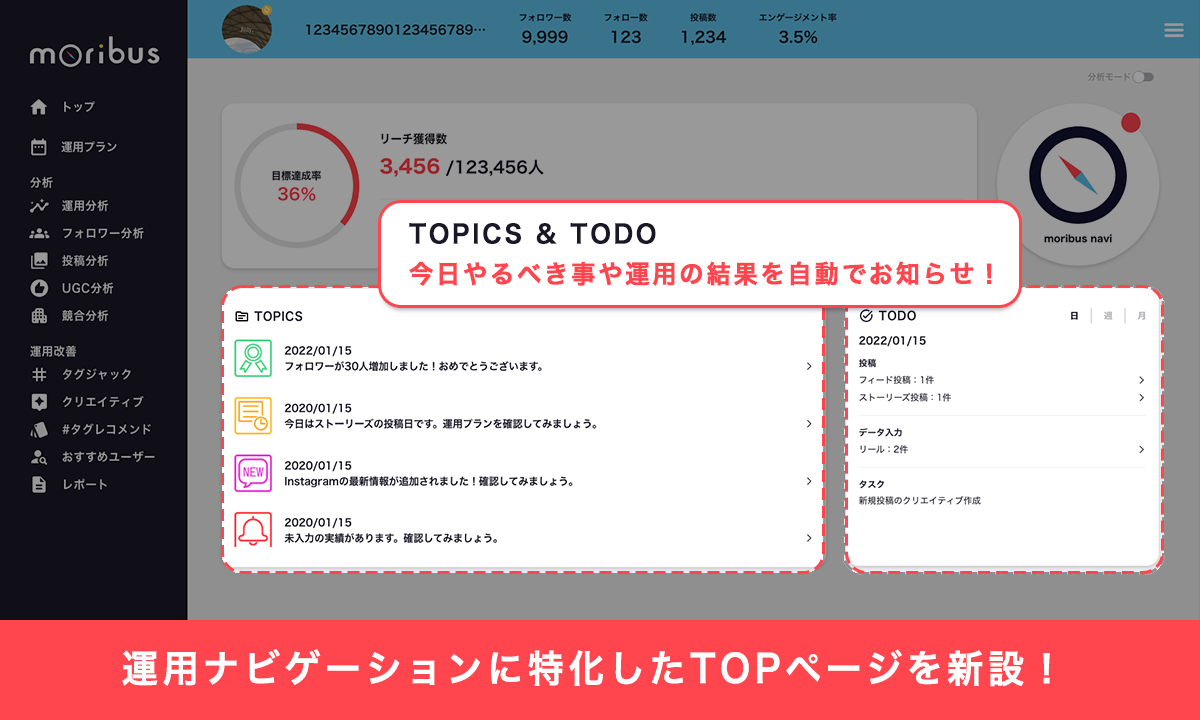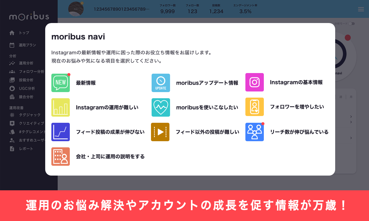 さらにアカウント運用の支援機能をアップデート!最新情報やお悩みからナビゲートする「moribus navi」を追加!