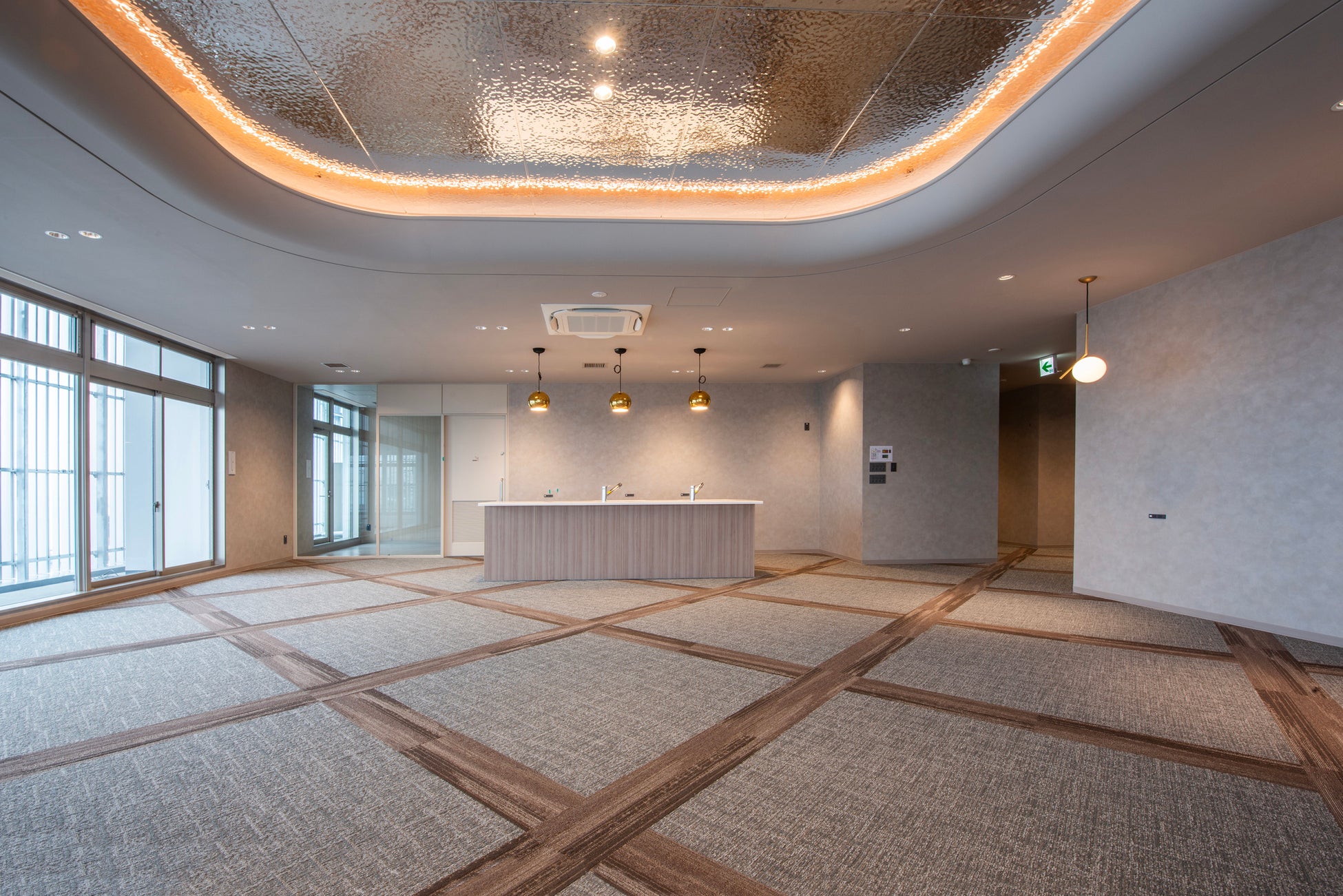 社員が心豊かに仕事ができるよう、休憩室の天井は水辺をイメージした落ち着いたデザインを採用しました。