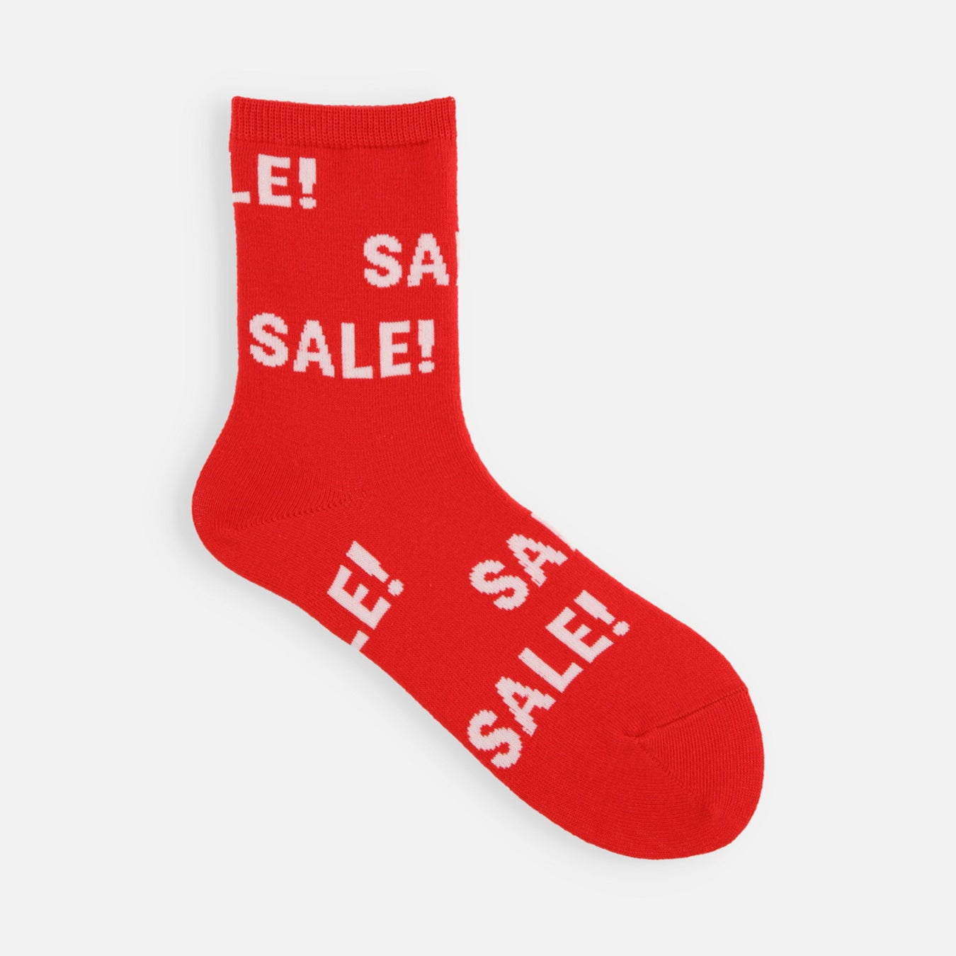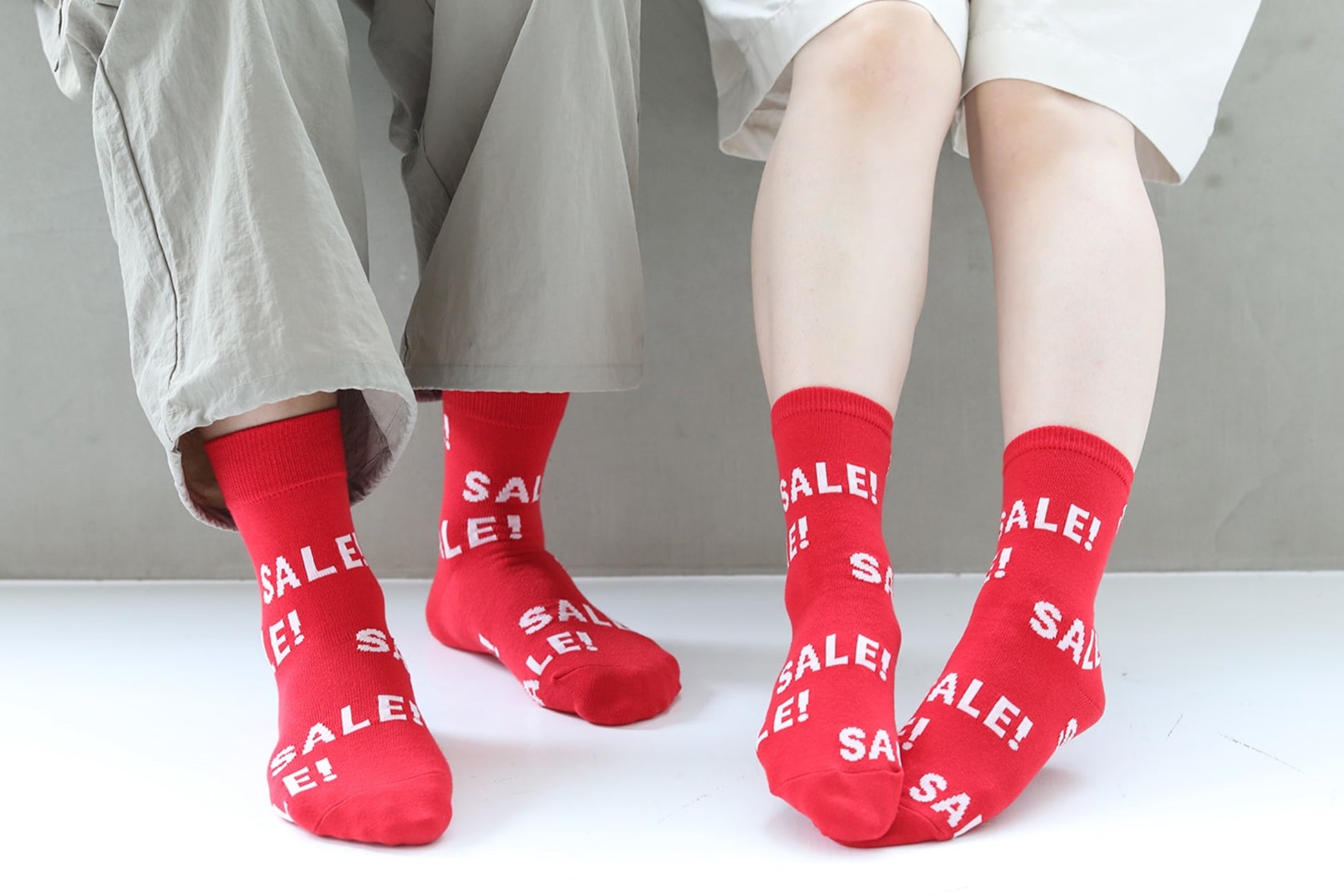 「SALE柄ソックス」は、赤ベースの全面に、 “SALE! ” の文字柄を多数、白抜きで表現したソックスです。