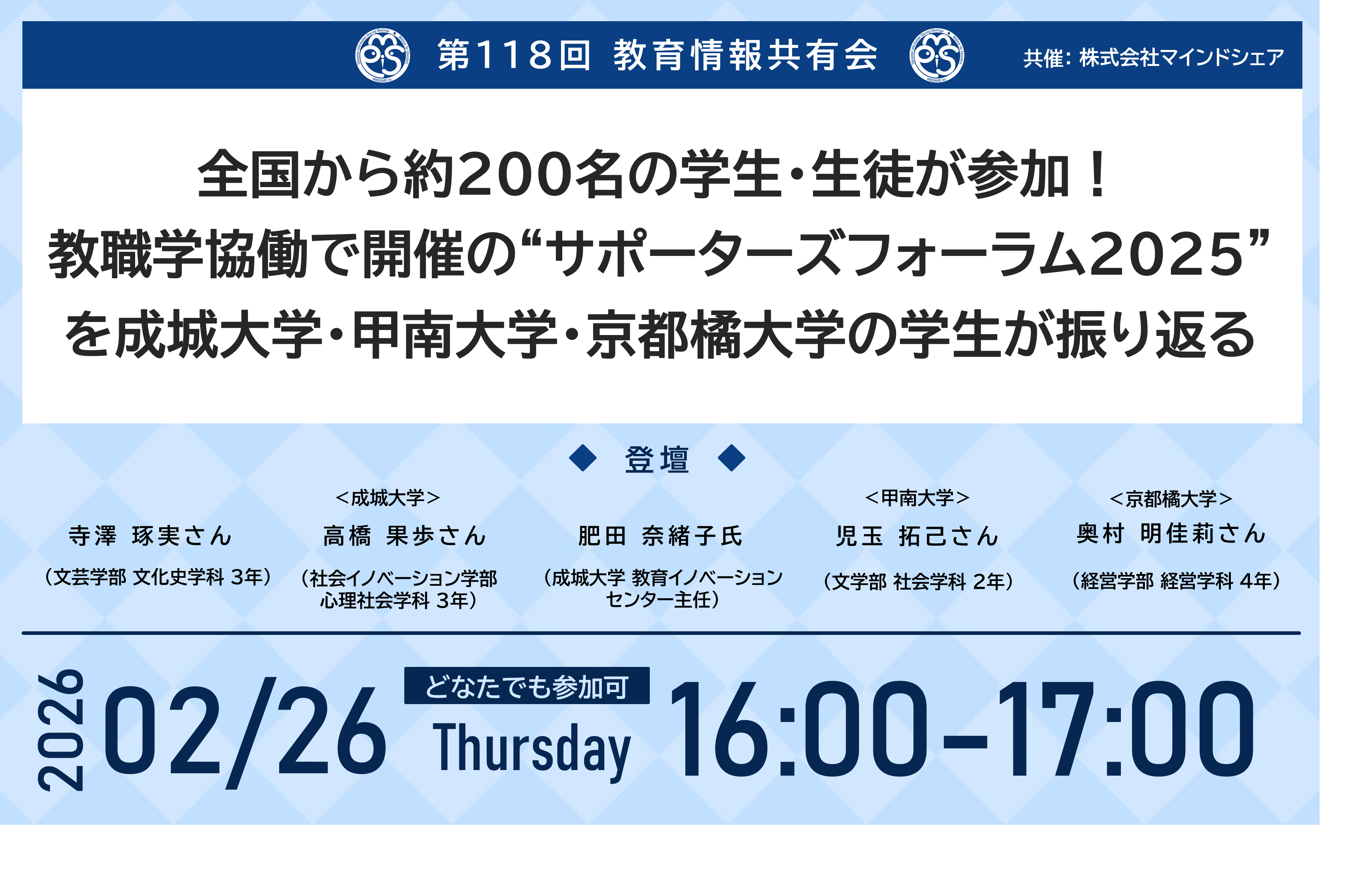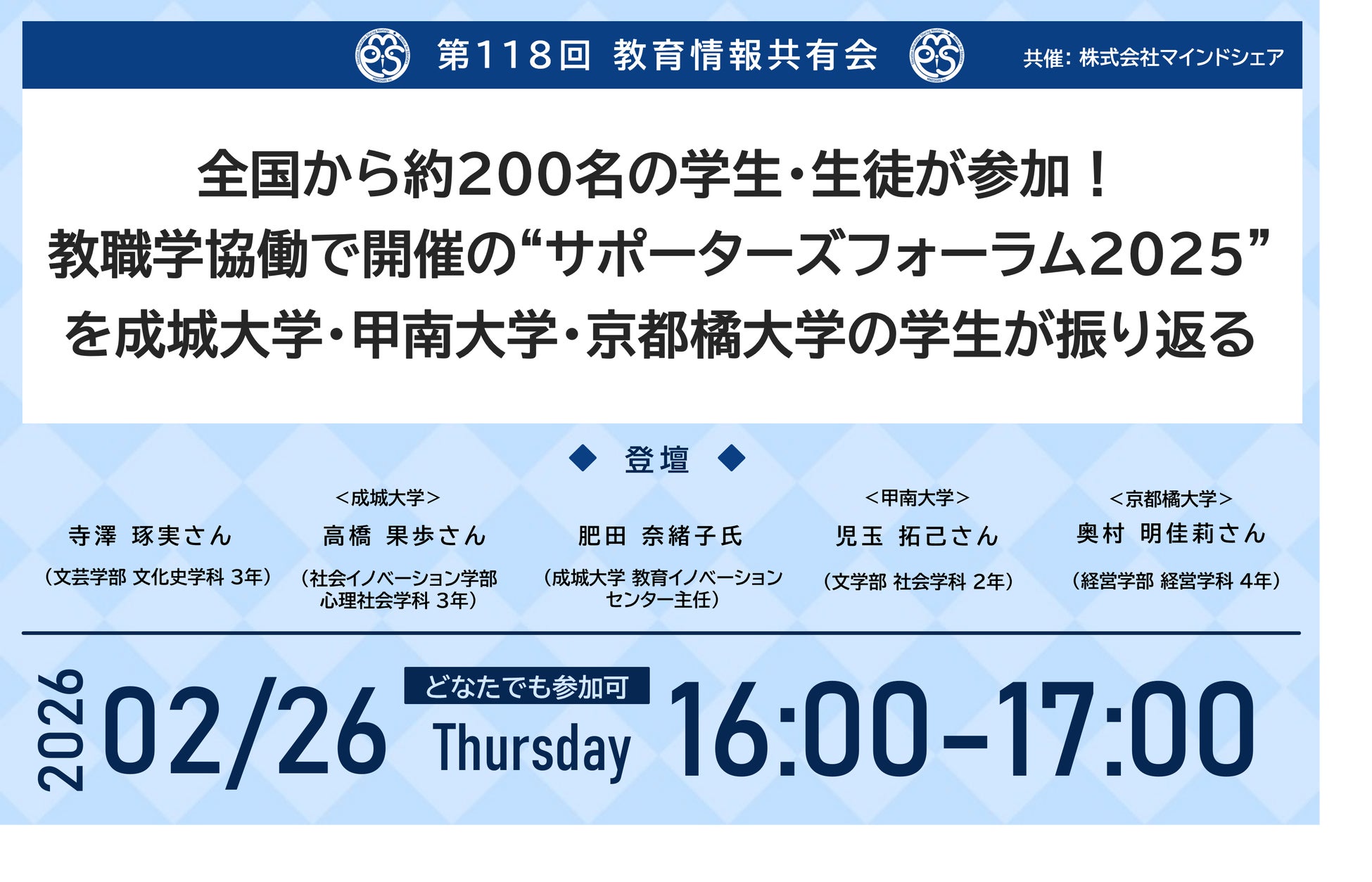 第118回教育情報共有会「全国から約200名の学生・生徒が参加!教職学協働で開催の“サポーターズフォーラム2025”を成城大学・甲南大学・京都橘大学の学生が振り返る」