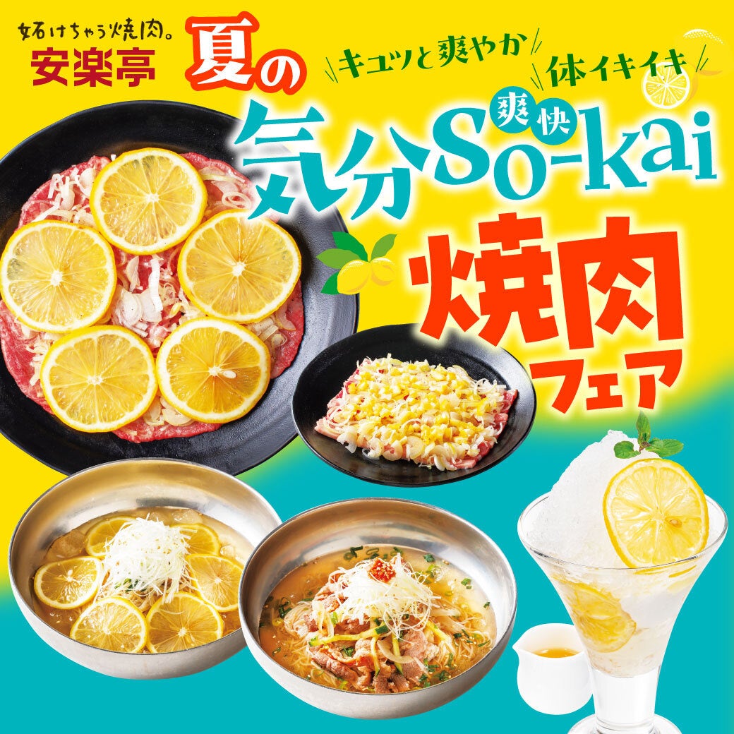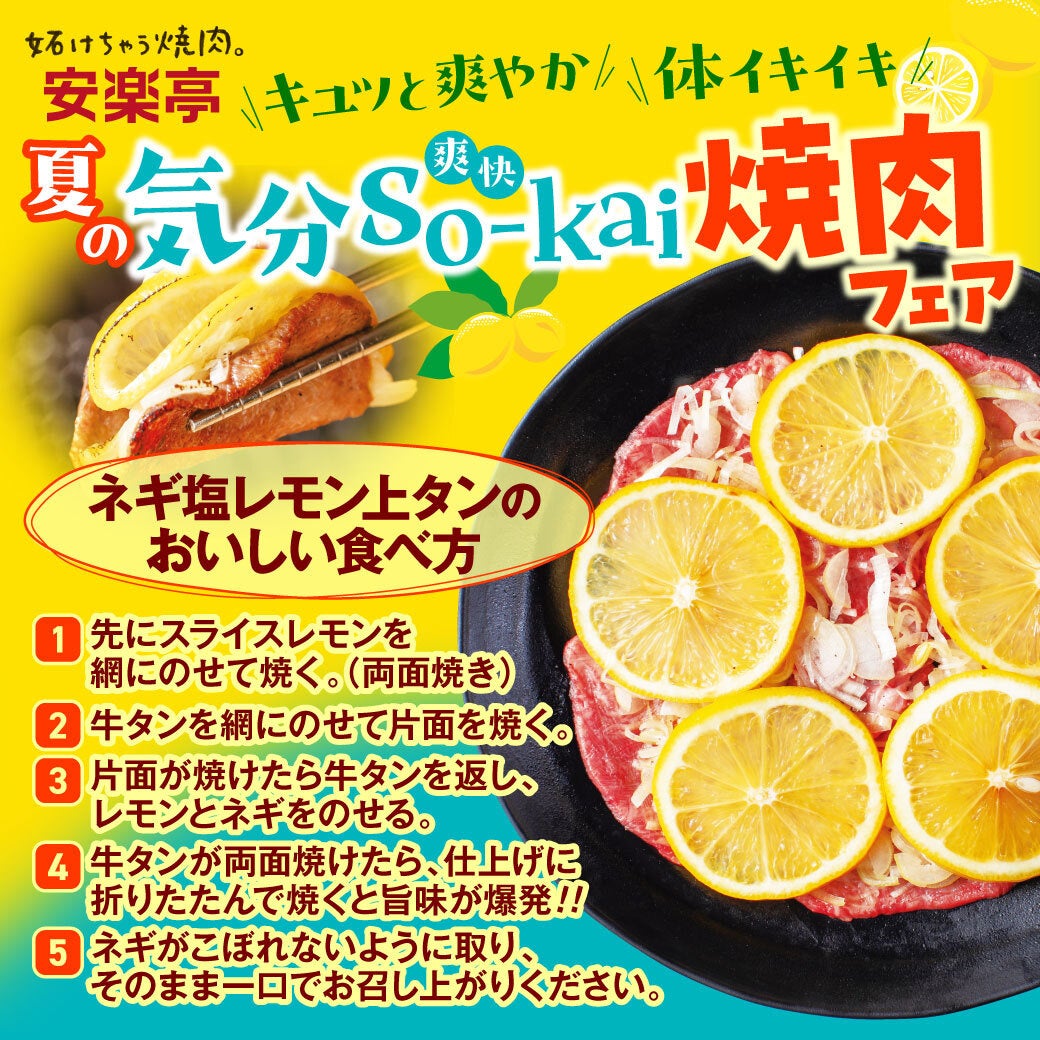 安楽亭の中でも特に人気の高い焼肉〝上タン〟〝カルビ〟などが、レモンと梅と爽やかにコラボして“So-kai(爽快)夏バージョン“で登場します。
