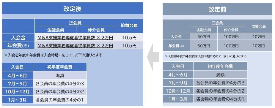 2024年4月より会費体系を改定することを決定しました。より多くのM&A支援機関に加入いただくため、小規模であっても入会しやすい会費体系に変更いたします。会員の大幅な拡大により倫理規程と業界自主規制ルールの実効性を高め、業界全体の健全な発展に寄与することを目指します。