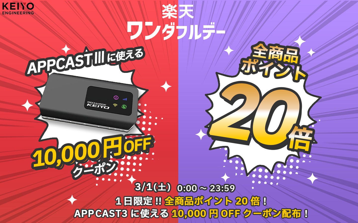 2025年3月1日 – 楽天市場にて開催される「楽天ワンダフルデー」にあわせ、3月1日限定で、人気製品APP CAST3を10,000円オフクーポンに加え、楽天ポイント20倍の大特価でご提供します。