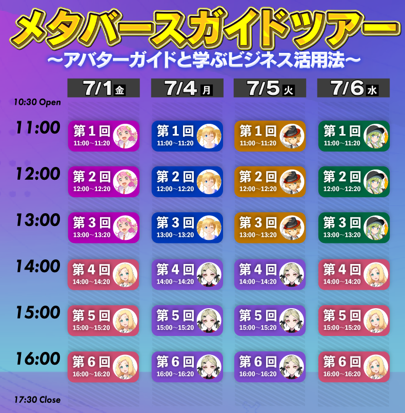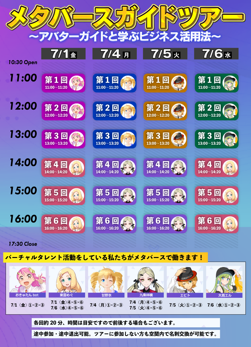 メタバース空間でビジネス活用法を学ぶ「メタバースガイドツアー」アバターガイド&タイムテーブル発表!(7月1日、4日、5日、6日 開催)