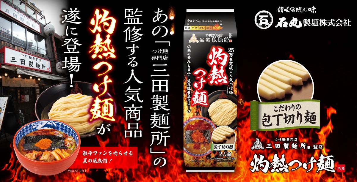 三田製麺所が監修を行い、石丸製麺株式会社様(本社:香川県高松市、代表取締役社長 石丸 芳樹 )が2024年3月に発売した「三田製麺所監修 灼熱つけ麺」が発売から4か月間で5万食突破!今回発売した商品は、一年中・全国のご家庭でお楽しみ頂けるよう"乾麺"にて製造。石丸製麺様が長年讃岐うどんの製造で培った自慢の”包丁切り製法”を用いて、"乾麺"とは思えない”もちもちの生麺のような食感を再現し、三田製麺所も自身をもって販売できる商品となっております。