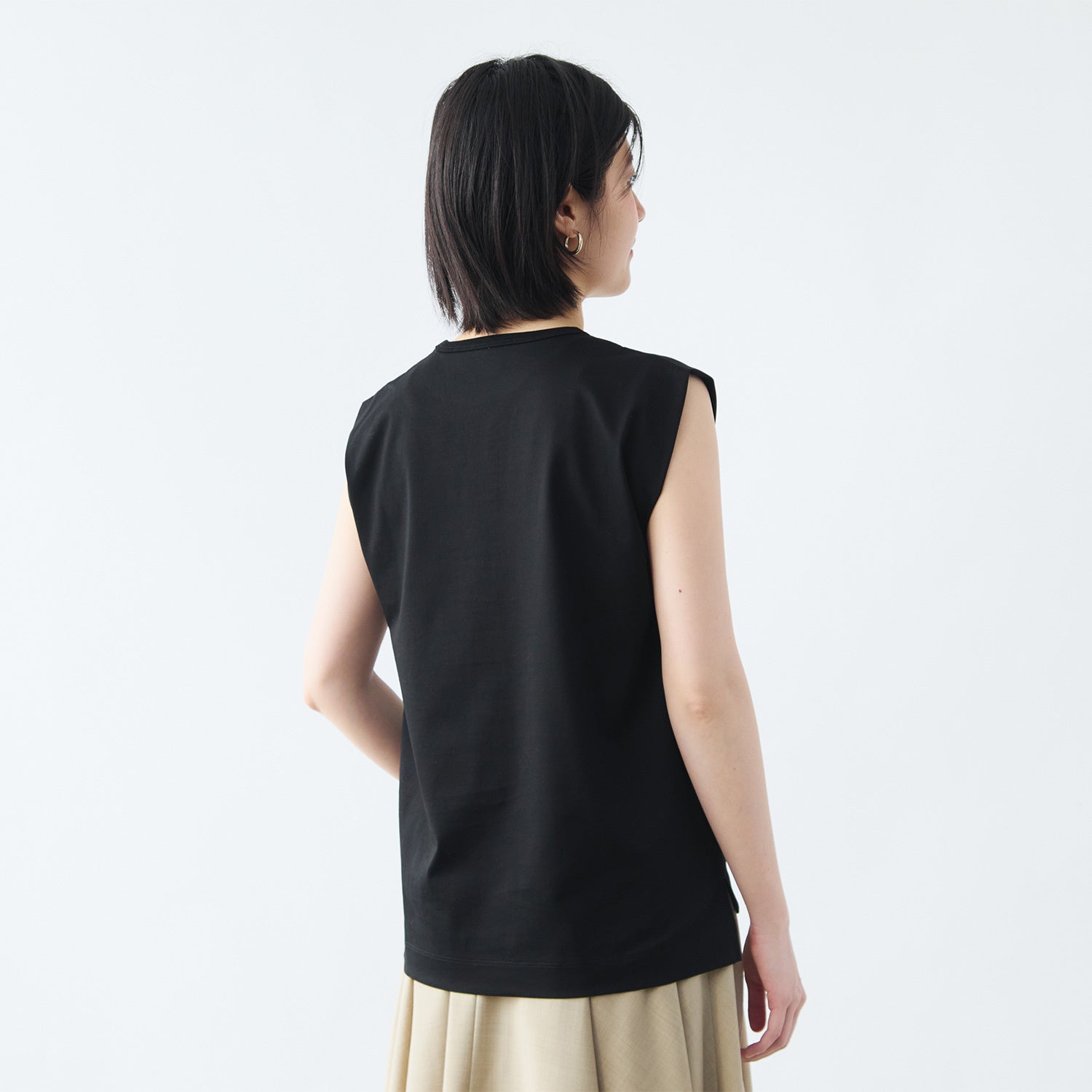 高級感たっぷりのドレスTシャツ生地×すっきり見えに定評のある極上シルエットの良いところどりをしたノースリーブです。