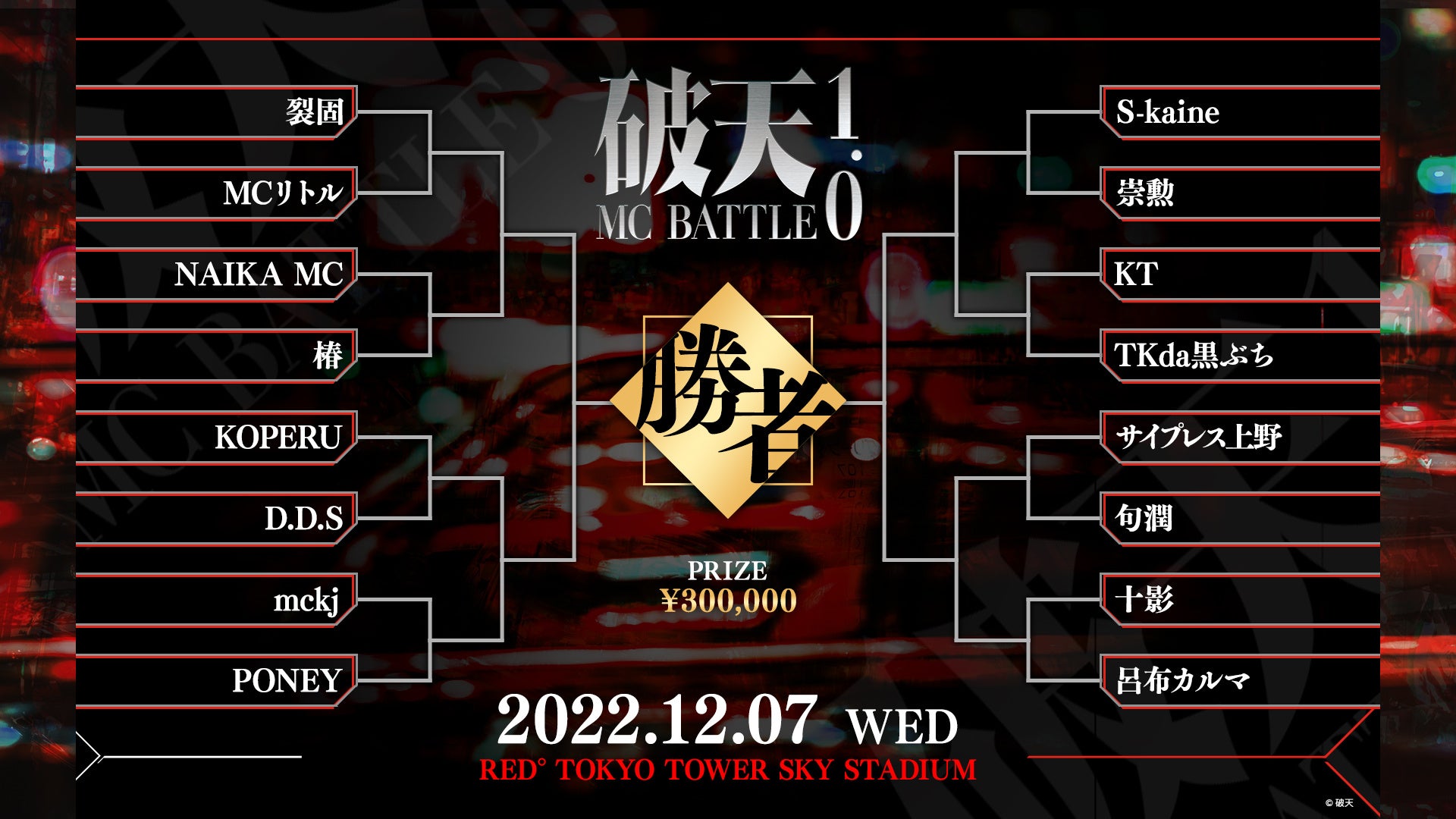 株式会社イザナギゲームズ(東京都江東区、プロデューサー兼CEO:梅田慎介)は、2022年12月7日(水)にRED° TOKYO TOWER SKY STADIUMにて実施する『破天MCBATTLE 1.0』トーナメント表を公開いたしました。また、「破天MCBATTLE公式YouTubeチャンネル」にて、『破天MCBATTLE 1.0』1回戦・第1試合から第8試合までを生配信することを発表いたしました。