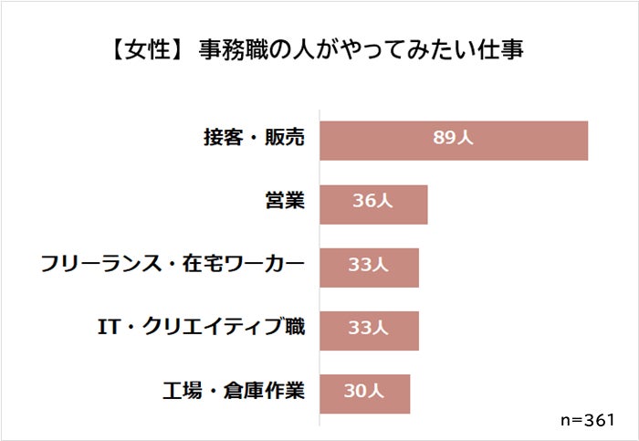 ・事務職の人がやってみたい仕事は女性が「接客・販売」、男性が「営業」