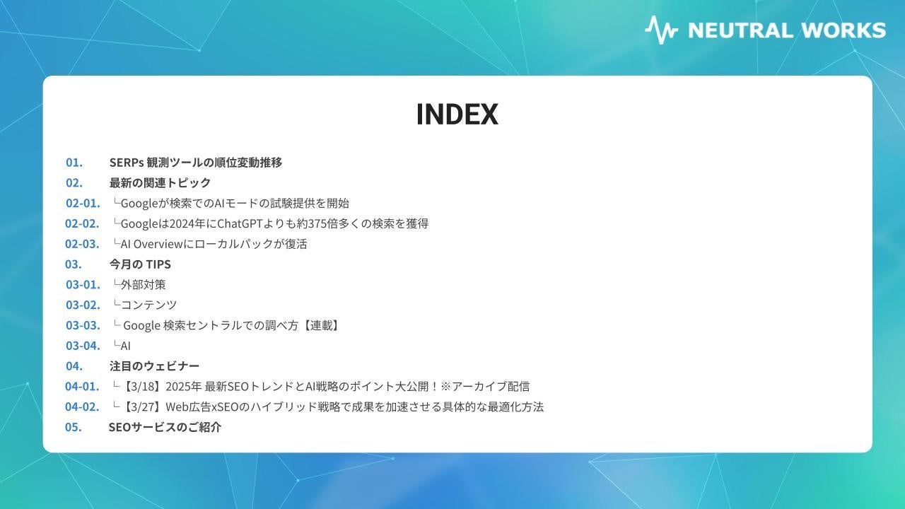 株式会社ニュートラルワークス(本社:神奈川県藤沢市、代表取締役:三木五月、以下「ニュートラルワークス」)は、自社の専門領域である、データ分析を活用した成果に繋げるためのSEO(検索エンジン最適化)に関する最新動向をまとめた「SEOトレンドレポート2025年3月号」を公開いたしました。