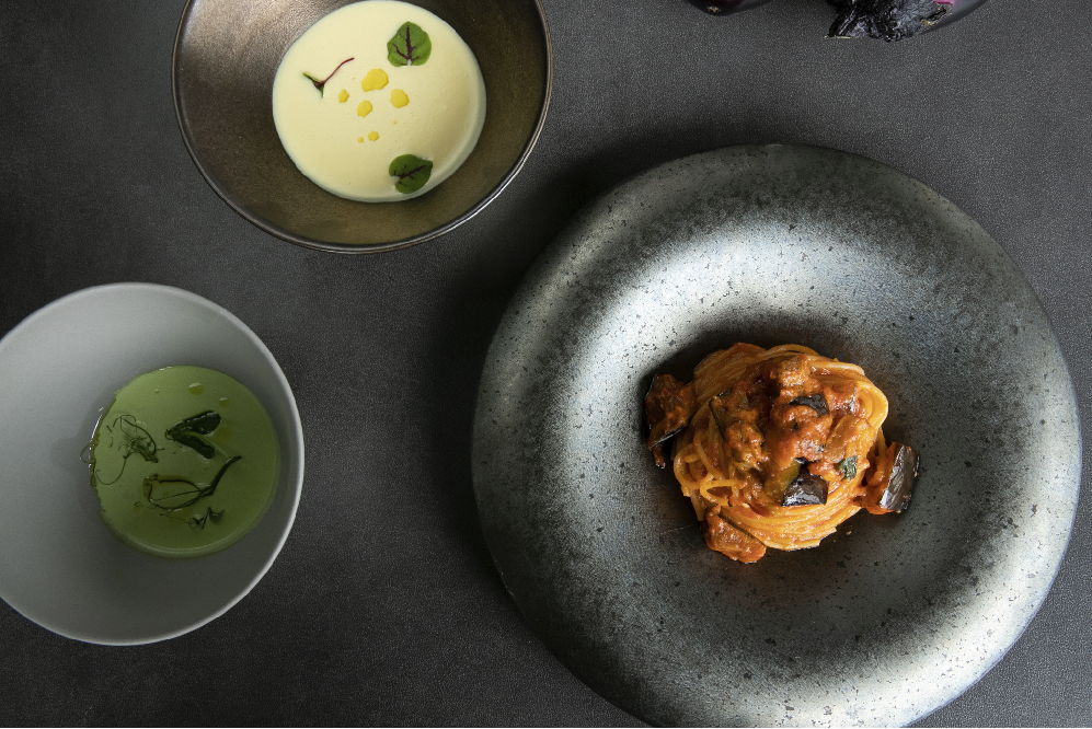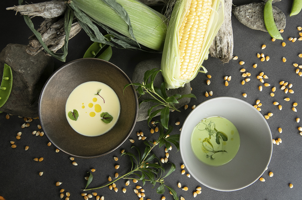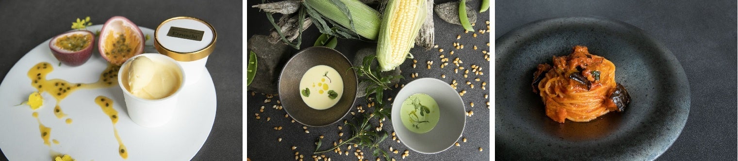 冷製スープとパスタソースのセットは、舌触りなめらかな夏野菜(とうもろこし、グリーンピース)のスープと、パスタを茹でて和えるだけで完成する京都賀茂ナスとトマトのソースがセットになっており、ご自宅で簡単に贅沢なイタリアンコースをお愉しみいただけるため、お中元や夏の贈りものにも最適です。
