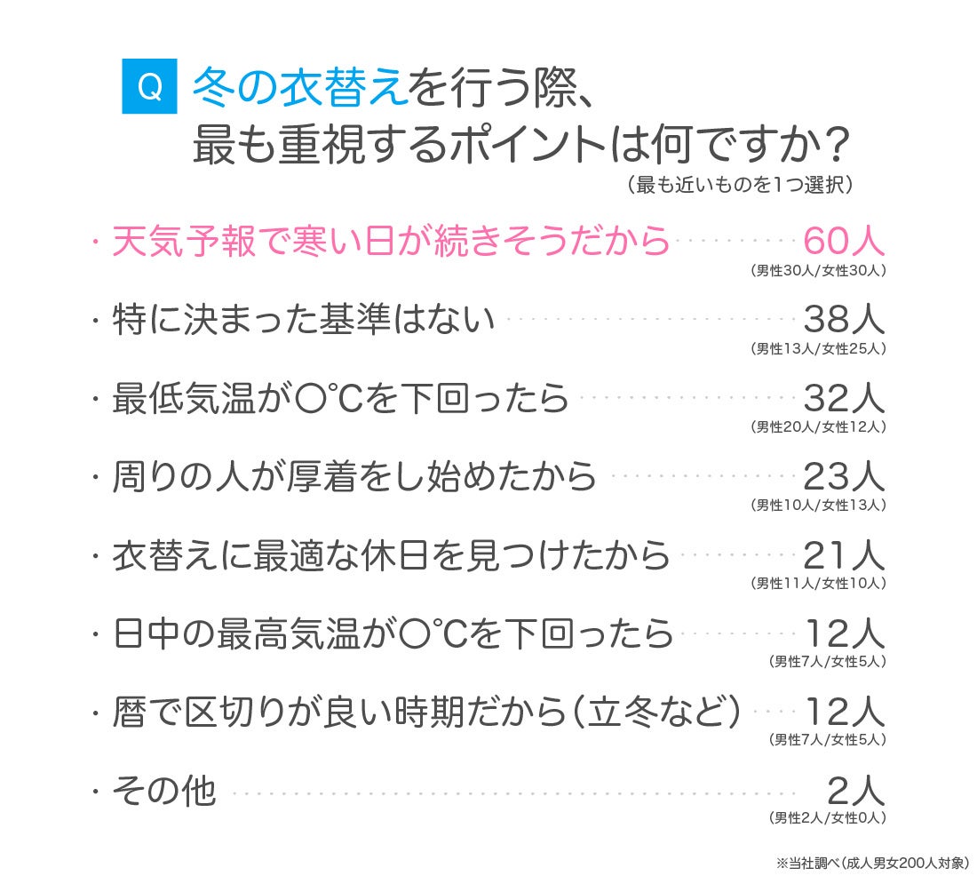 夏の衣替えと同様、冬の衣替えでも「天気予報で寒い日が続きそうだから」が1位となりました。