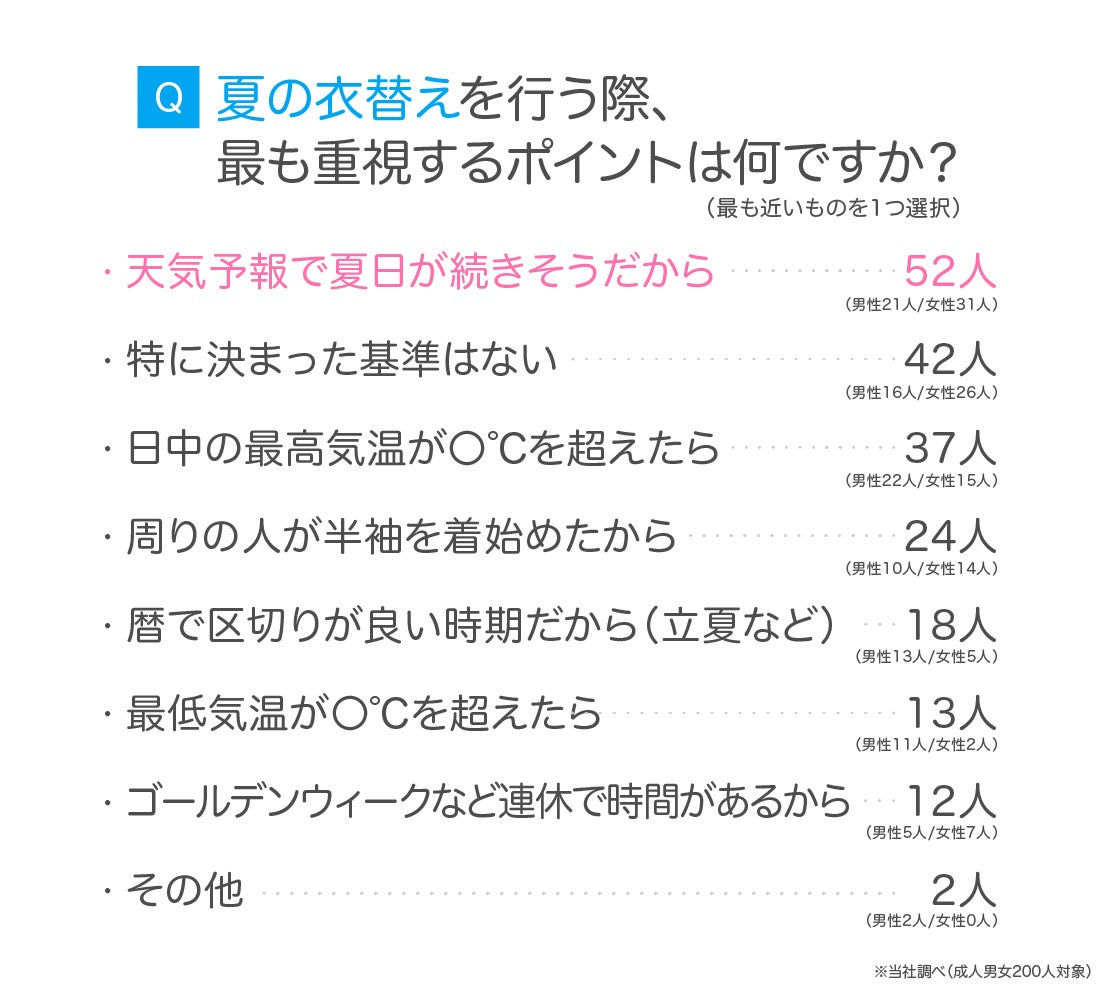アンケート結果から、多くの人が「気温」を衣替えの1つの基準にしていることが分かりました。