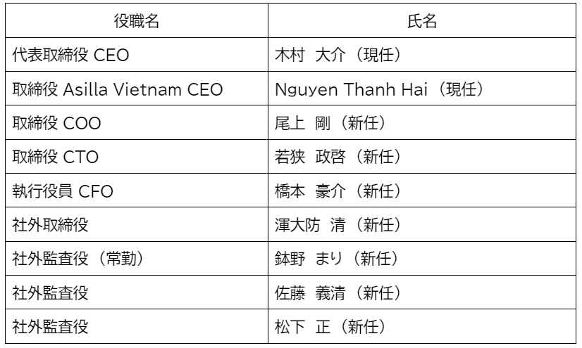 アジラは設立9期目に突入し、体制強化に取り組んでいます。この度、さらなる事業規模の拡大と、経営体制を強化すべく、取締役 COOに尾上 剛、取締役 CTOとして若狭 政啓、執行役員 CFOに橋本 豪介が就任いたしました。また、渾大防 清氏を社外取締役に、鉢野 まり氏を社外監査役(常勤)に、佐藤 義清氏、松下 正氏、両名を社外監査役に招聘したことをご報告いたします。