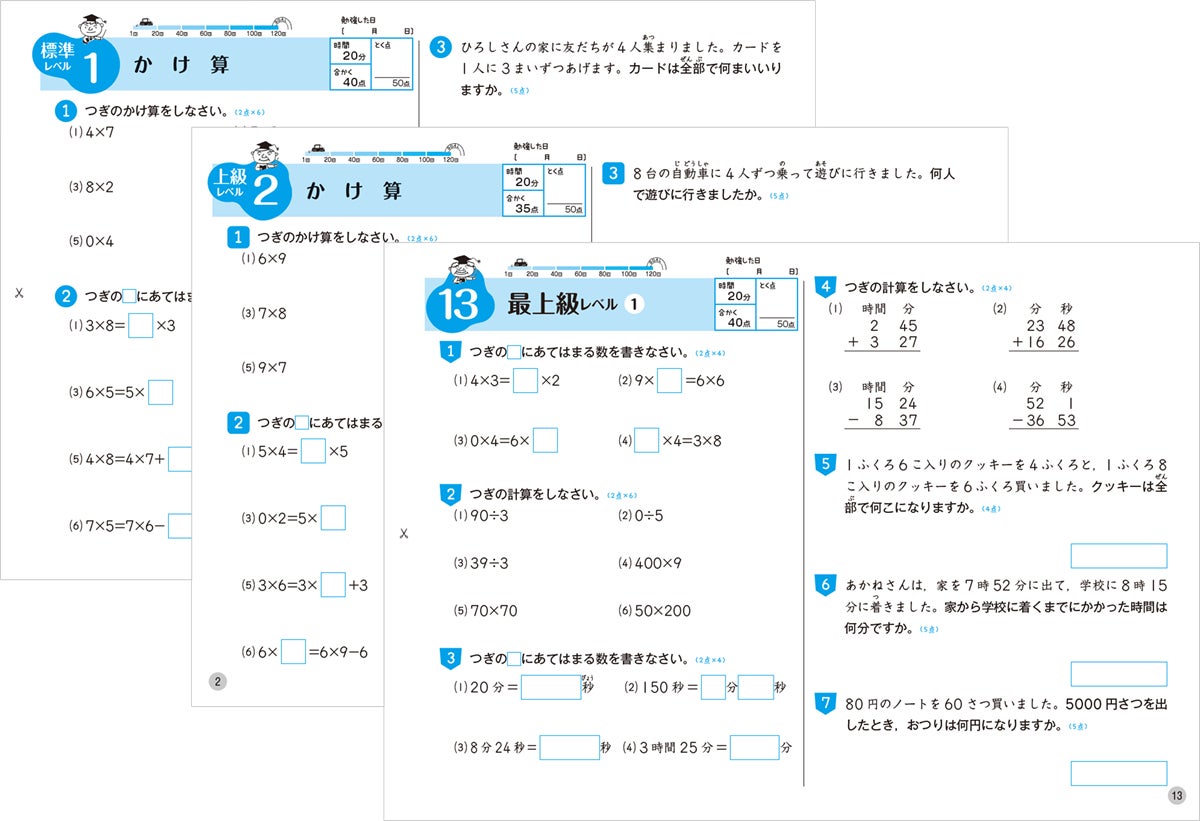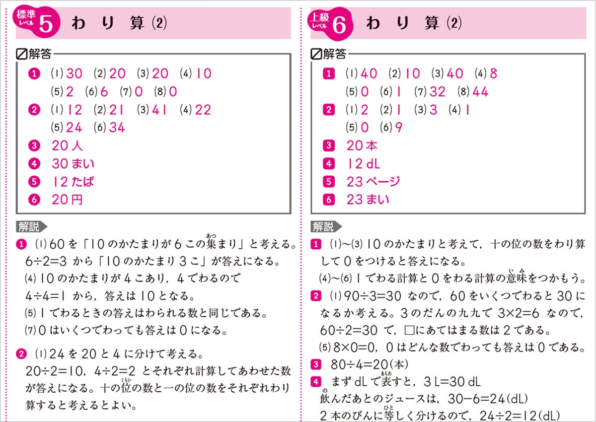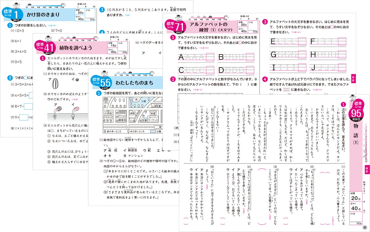 1単元は表裏の2ページ構成で、表面は教科書の学習範囲程度の「標準レベル」、裏面は少し難しい教科書の範囲を超えた「上級レベル」の問題です。また、全科は各教科(※英語を除く)の最後に、算数/国語は数単元ごとに「最上級レベル」の問題を設けています。