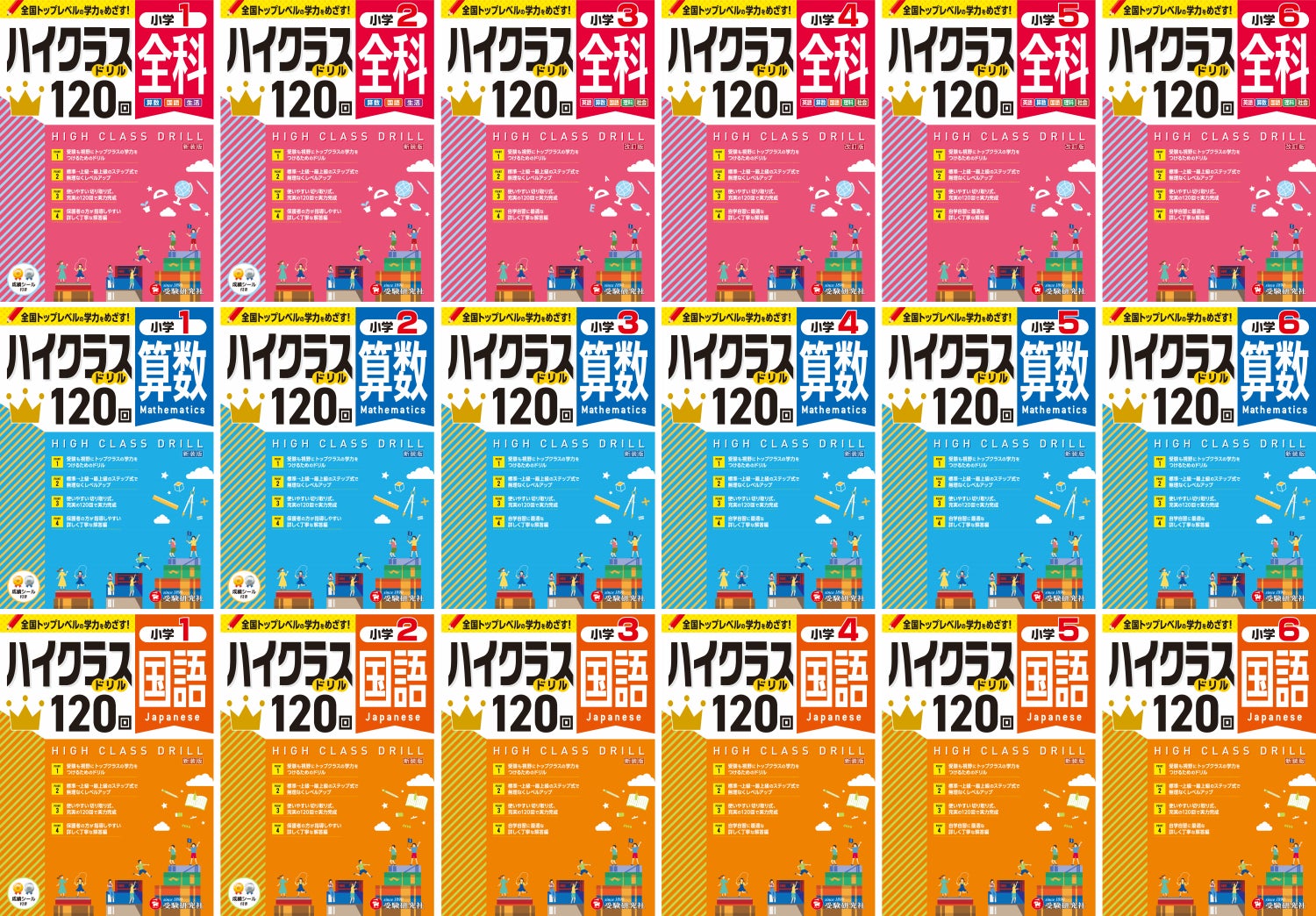全科/算数/国語の3タイプ。小1~小6まで学年別に合計18点をラインナップ!