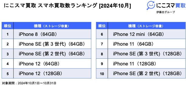 2024年10月の販売数ランキングでは、全体的に取引数が増加する中、iPhone SE(第2世代)が11ヶ月連続で1位にランクインしました。