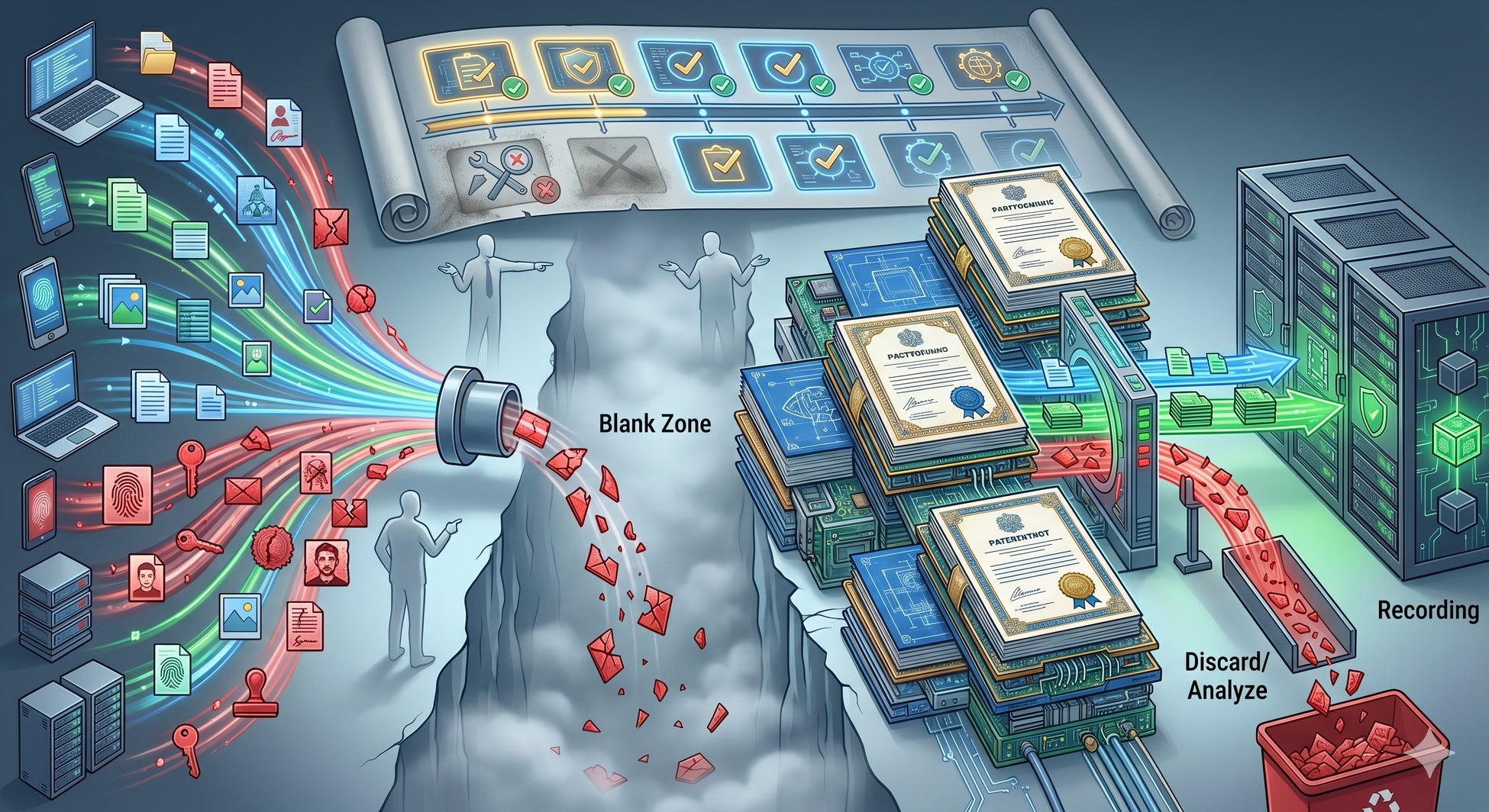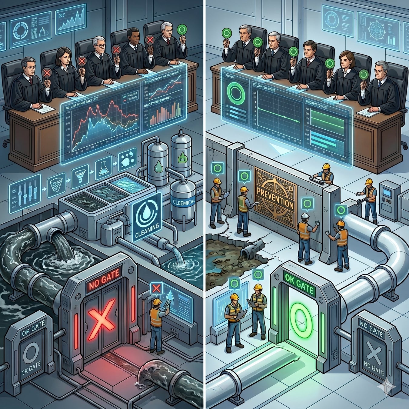 サイカルトラストの特許群が採用したのは、これと正反対の設計思想です。すなわち、「汚染水を浄化」するのではなく、「汚染水をそもそもパイプに流入させない」というアプローチです。データの記録・学習に先立ち、「マルチAI」が合議体としてデータの真正性を審査し、合格したデータのみを通過させる「入口ゲート」そのものを権利化いたしました。