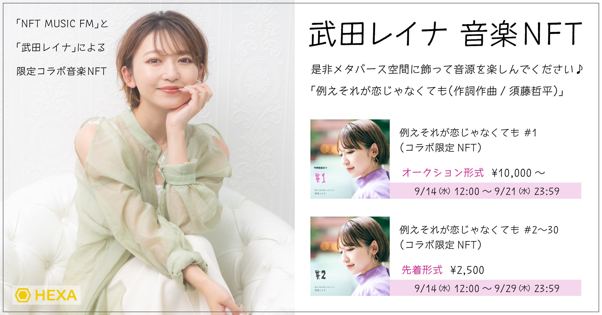 NFTマーケットのHEXA(ヘキサ)では、「NFT MUSIC FM」と「武田レイナ」による限定コラボ音楽NFTが9/14(水)12時から販売されます。