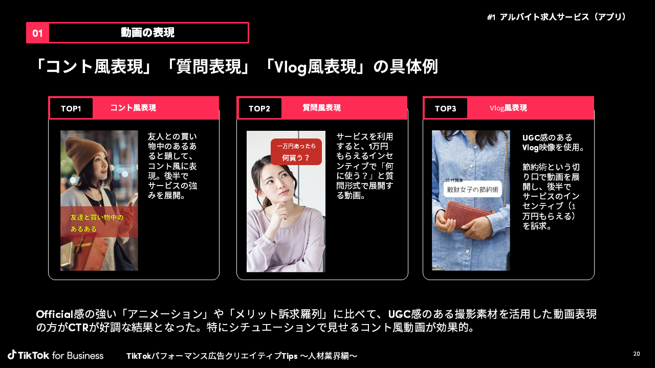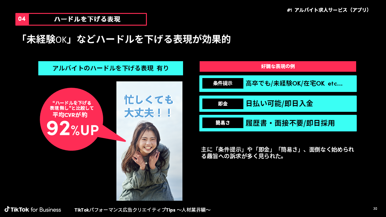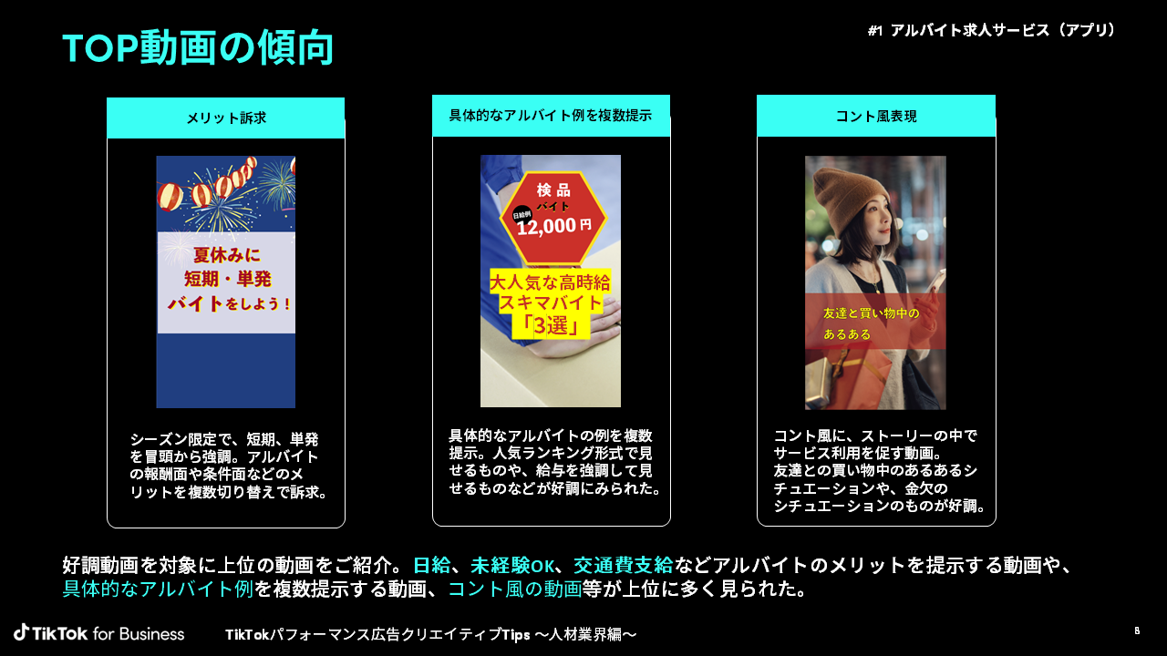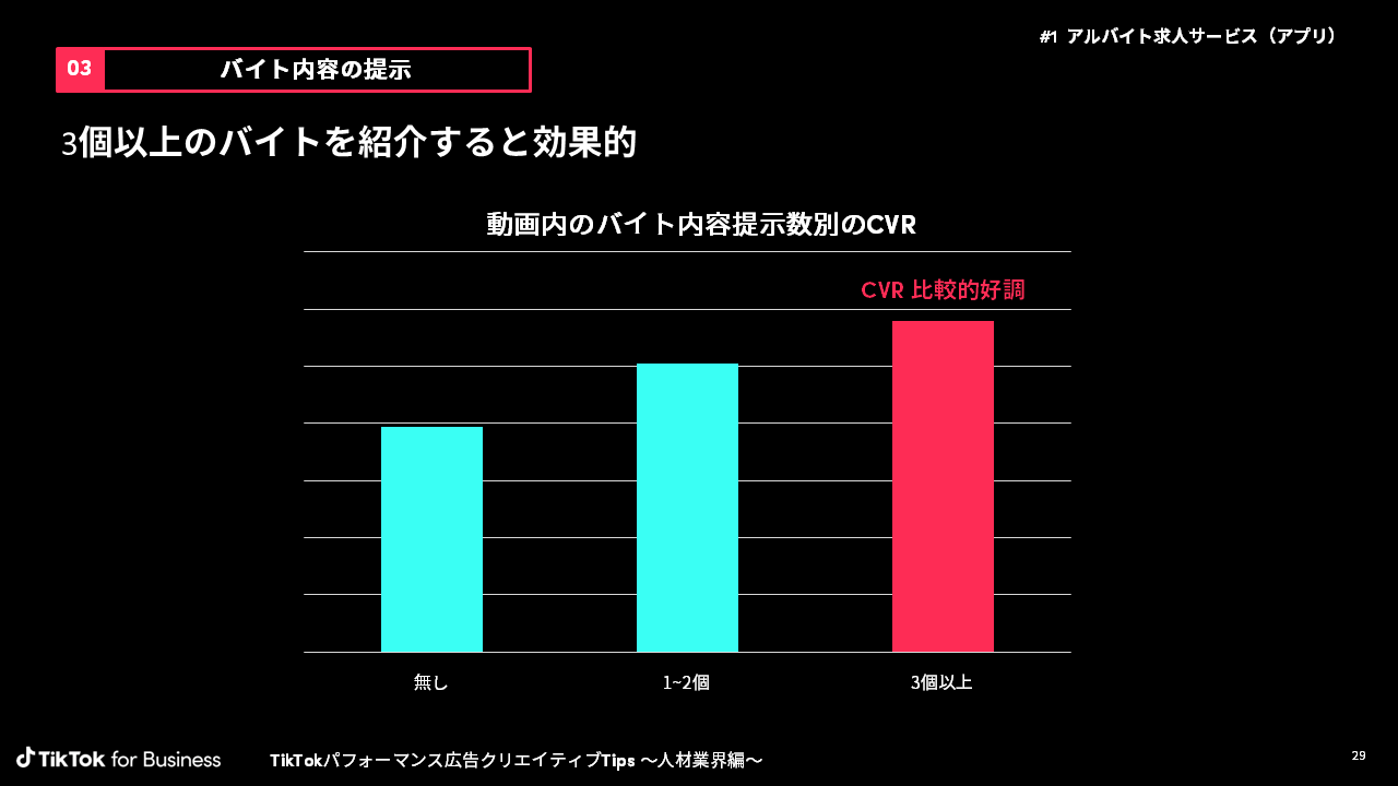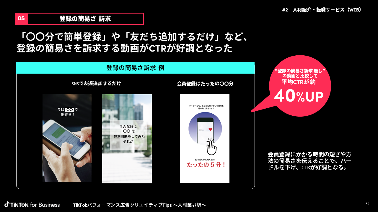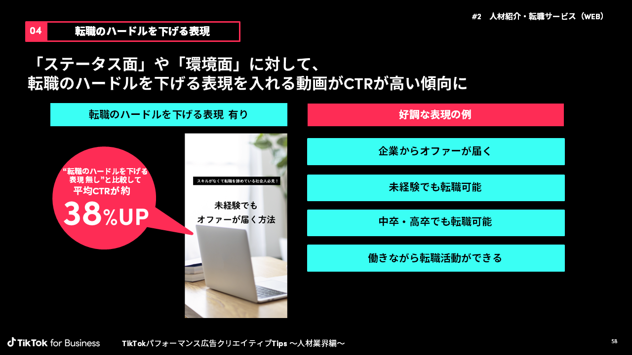 この結果をもとに動画広告の活用において、より獲得効率を高めるクリエイティブのポイントをまとめた「TikTokパフォーマンス広告クリエイティブTips 〜人材業界編〜」を初公開しました。