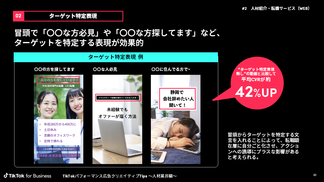 この他、詳しい解説については「TikTokパフォーマンス広告クリエイティブTips 〜人材業界編〜」にまとめています。